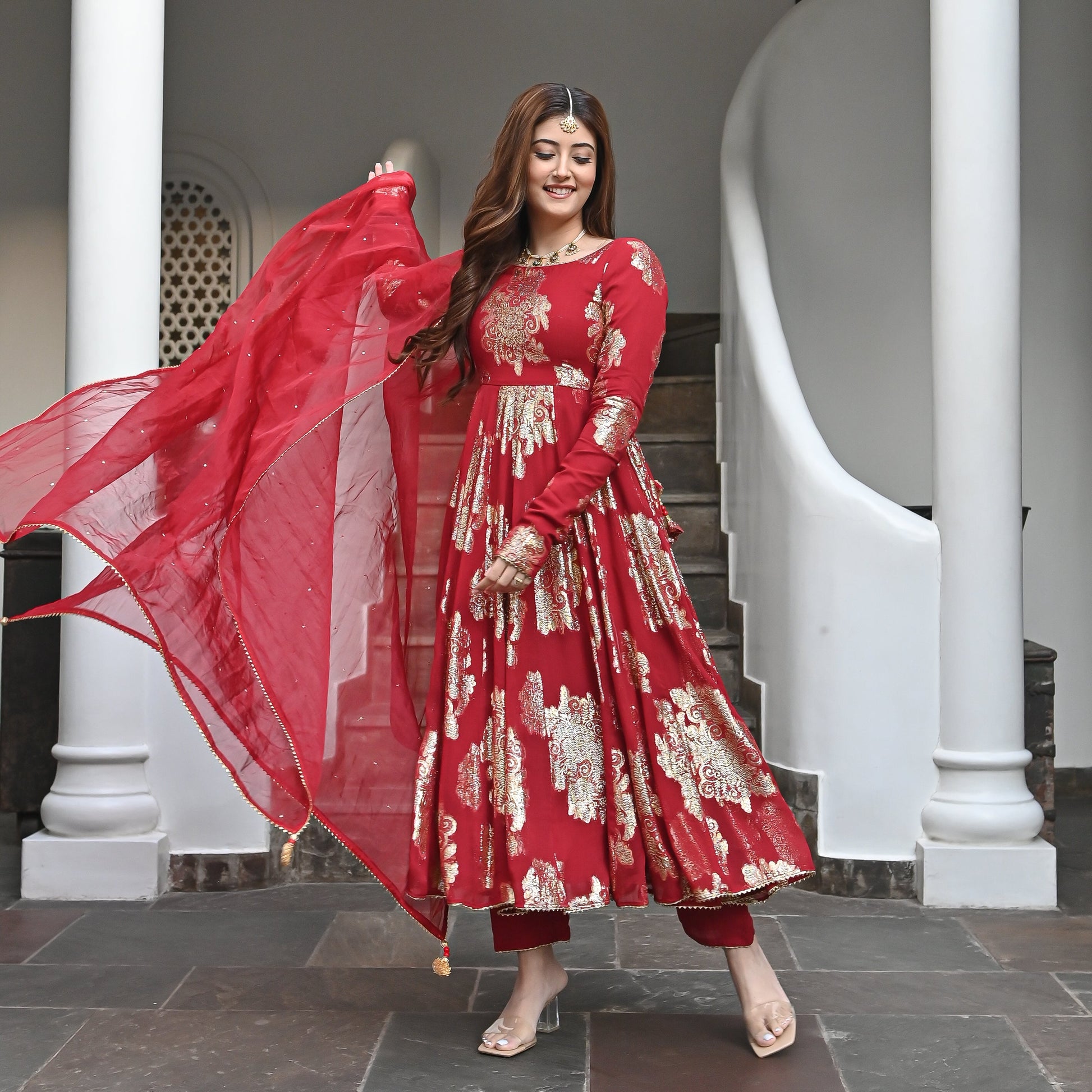 Get ready to make a bold fashion statement with our Shama Suit Set. Crafted from high-quality cotton silk, this Set features beautiful red floral jacquard motifs that are both feminine and chic. The organza dupatta, with its delicate tassels on the corners, adds a touch of romance and elegance to the overall look. The Set also boasts a comfortable fit, along with its trendy design, making it a perfect choice for any occasion where you want to look your best. Don't miss out on this stylish and unique addition to your wardrobe.