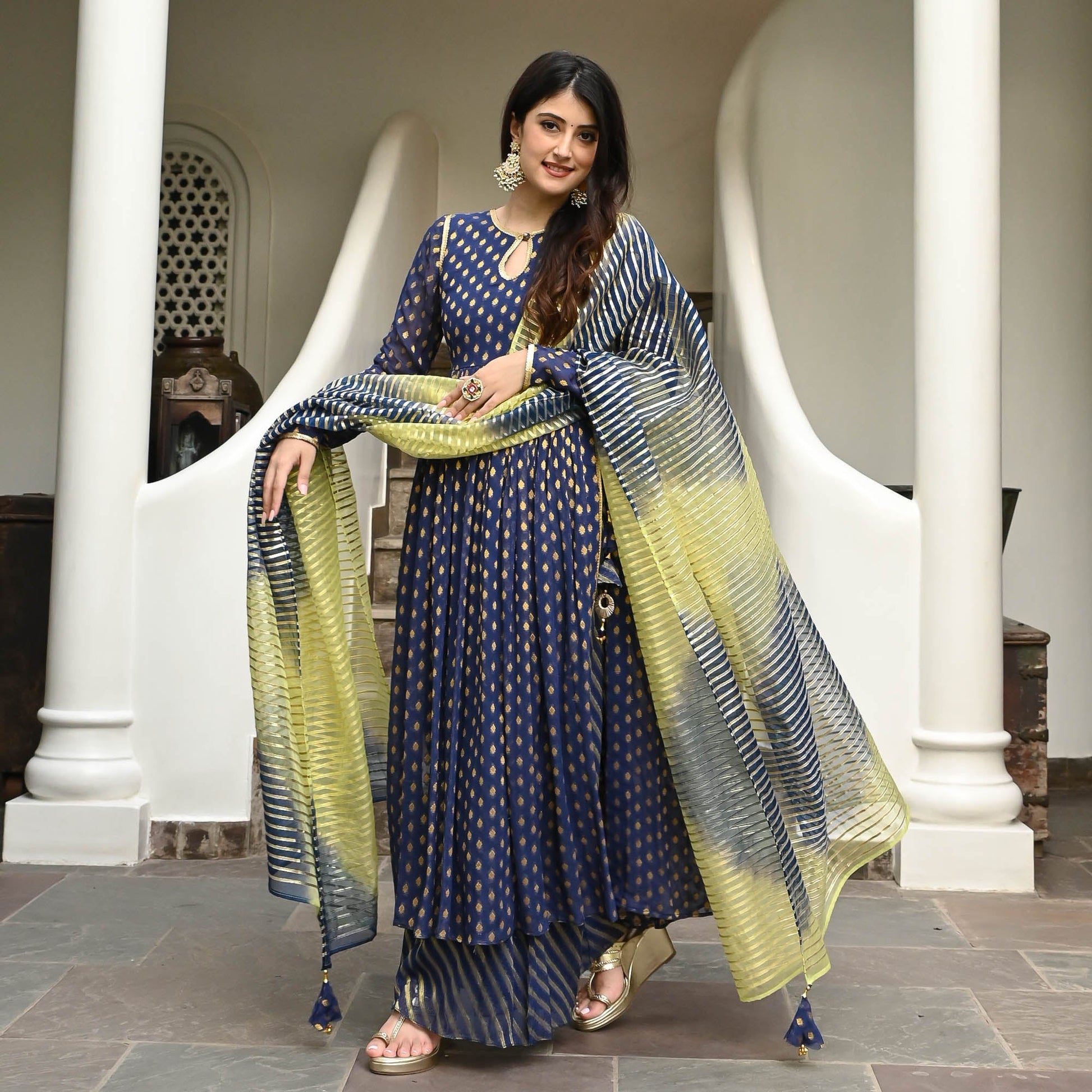 Elegance takes centre stage with our Shree Suit Set, a masterpiece crafted from opulent navy blue jacquard fabric. This ensemble boasts a chic keyhole neckline, adding a hint of allure to its sophistication. Intricate gotta work detailing enhances its charm, while a complementing striped organza dupatta lends a touch of contemporary flair.