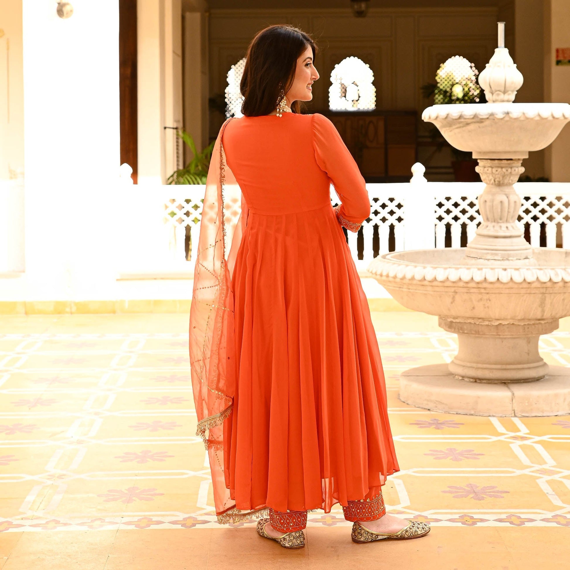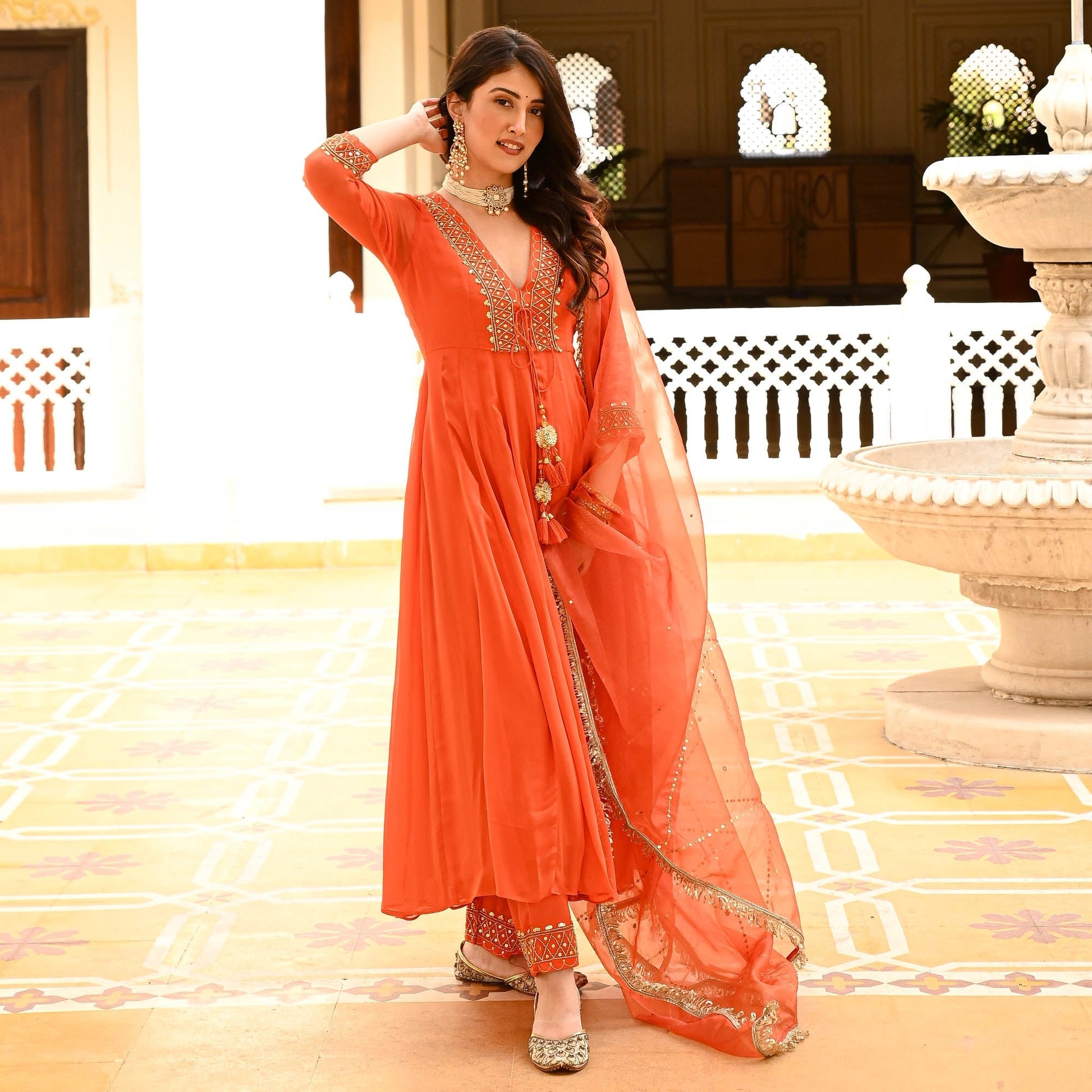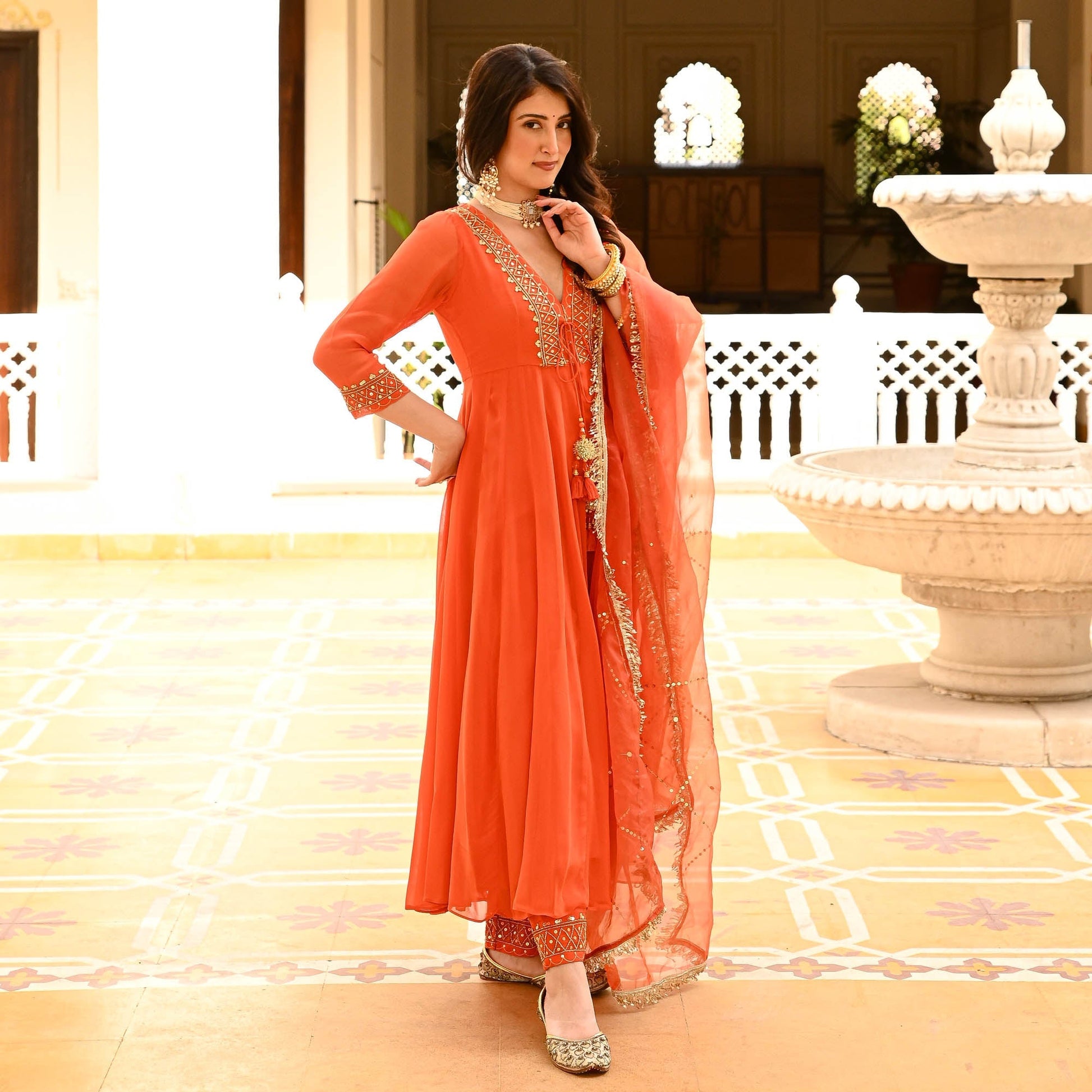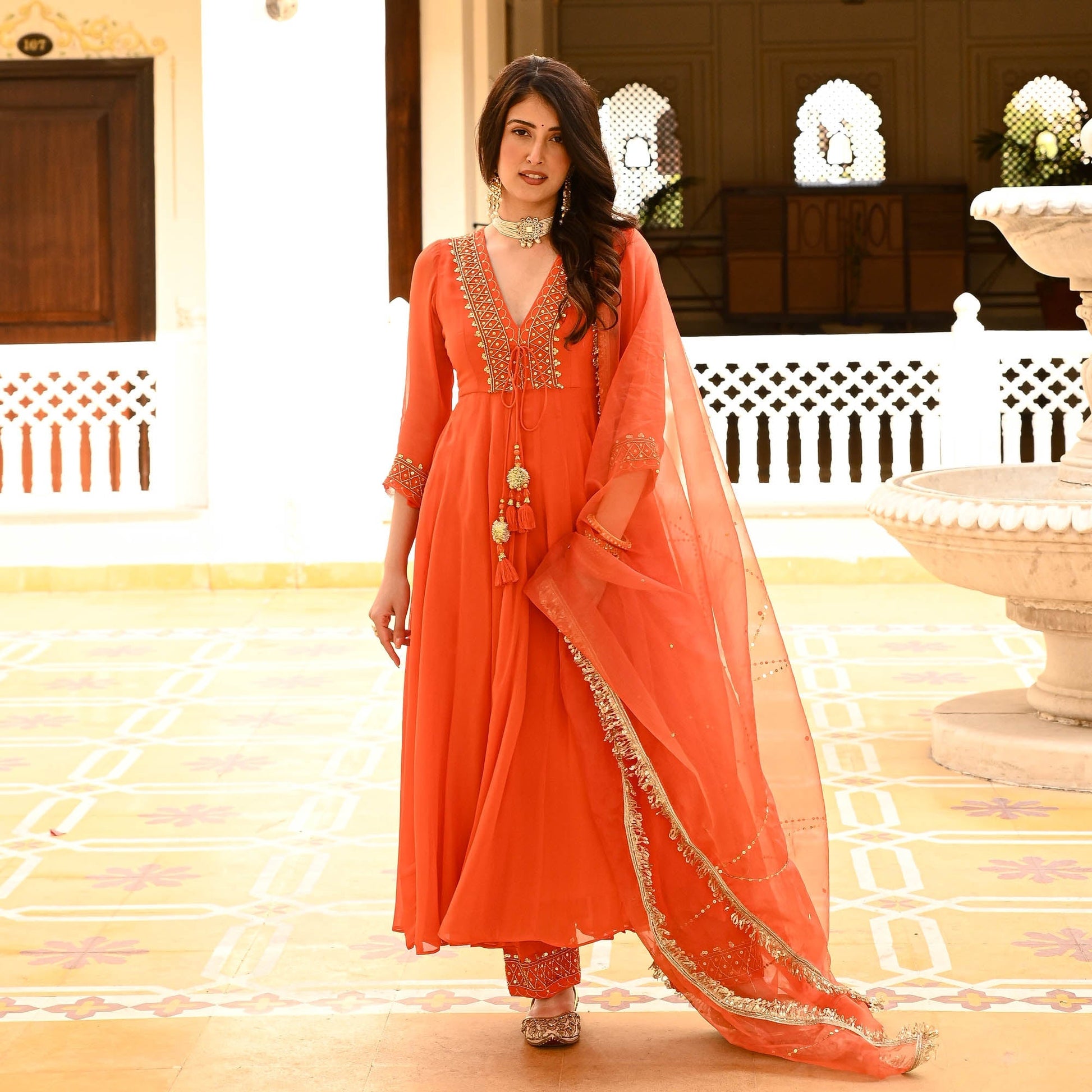 Radiate in the resplendence of the Sitara Suit Set, fashioned from opulent orange georgette. The three-quarter sleeved Anarkali-style kurta captivates with sequin work on the yoke, enhanced by charming tassel-up details and a flattering v-neckline. Accompanied by matching pants and an organza dupatta adorned with shimmering sequin embellishments and delicate fringe lace edging, it's a luminous ensemble for every occasion.