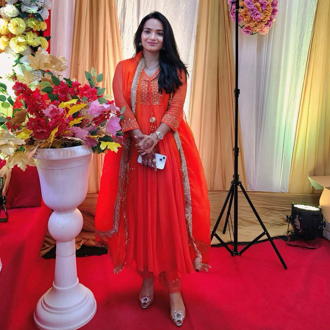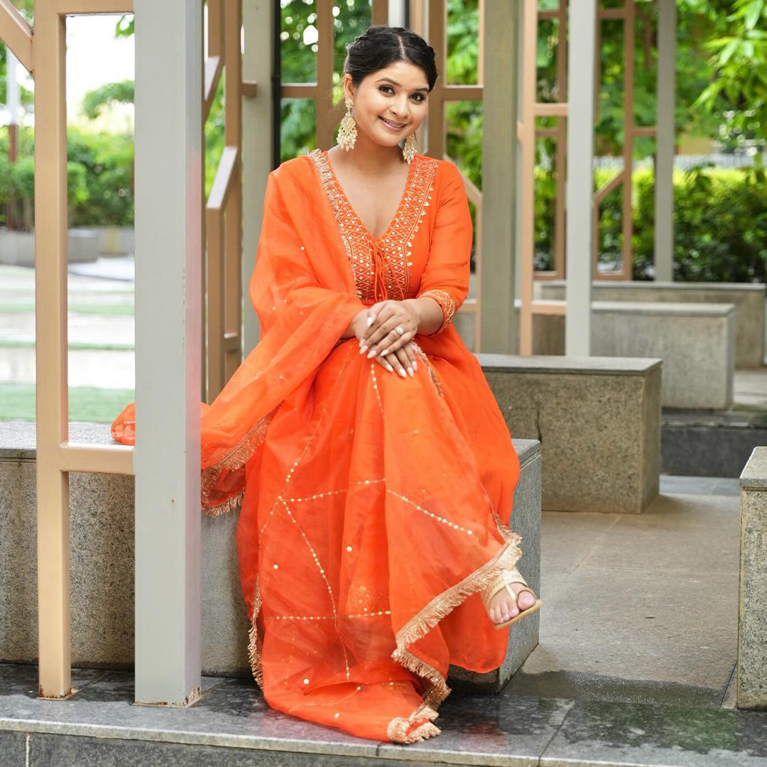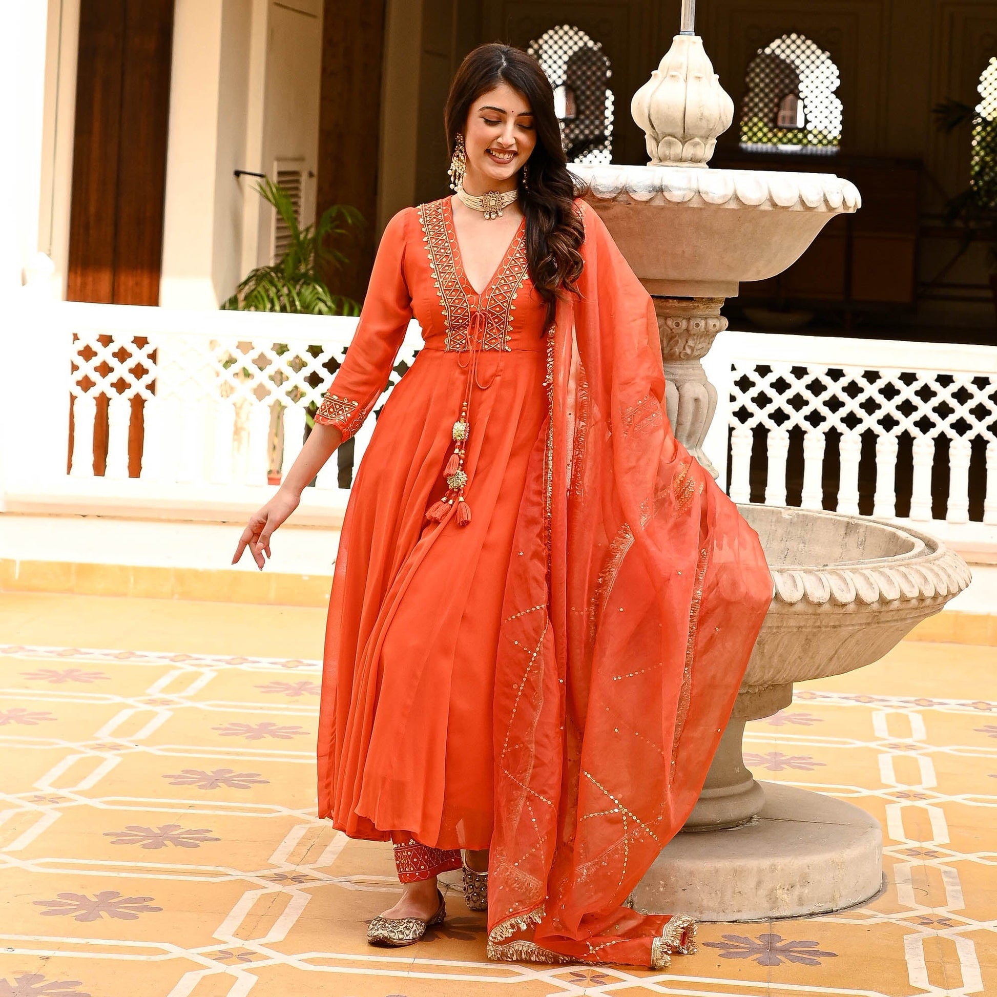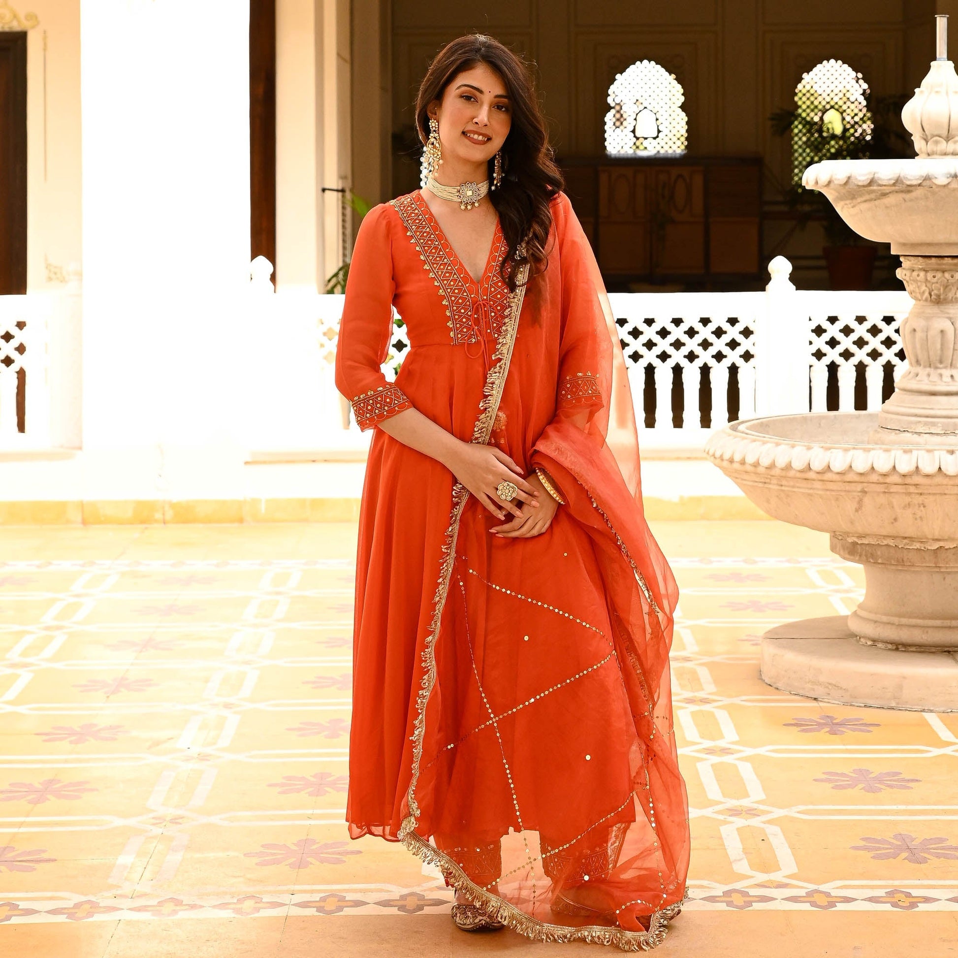 Radiate in the resplendence of the Sitara Suit Set, fashioned from opulent orange georgette. The three-quarter sleeved Anarkali-style kurta captivates with sequin work on the yoke, enhanced by charming tassel-up details and a flattering v-neckline. Accompanied by matching pants and an organza dupatta adorned with shimmering sequin embellishments and delicate fringe lace edging, it's a luminous ensemble for every occasion.