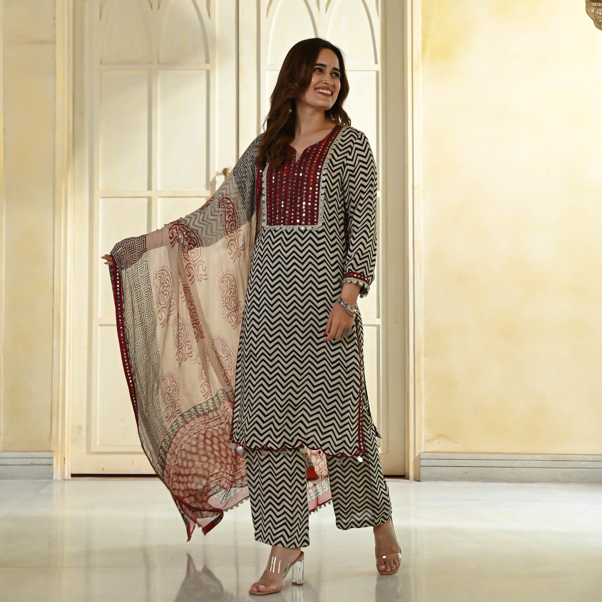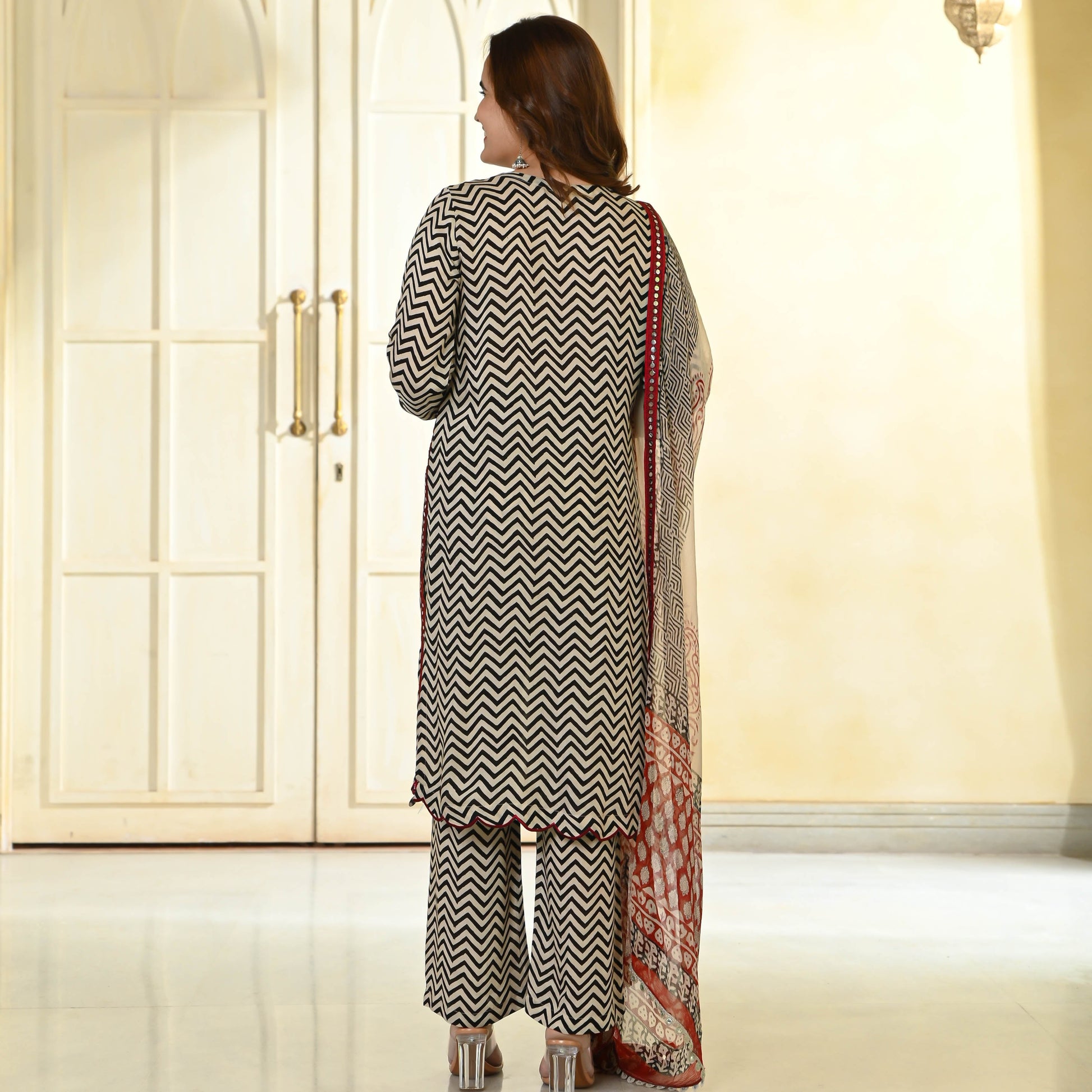 Indulge in the charm of our Stripes Natural Dye Suit Set, where heritage meets contemporary elegance. Expertly tailored from luxurious cotton silk fabric, this ensemble seamlessly blends opulence and comfort. The classic stripe pattern, naturally dyed to perfection, graces the ensemble, accentuated by a delicate chiffon dupatta.
