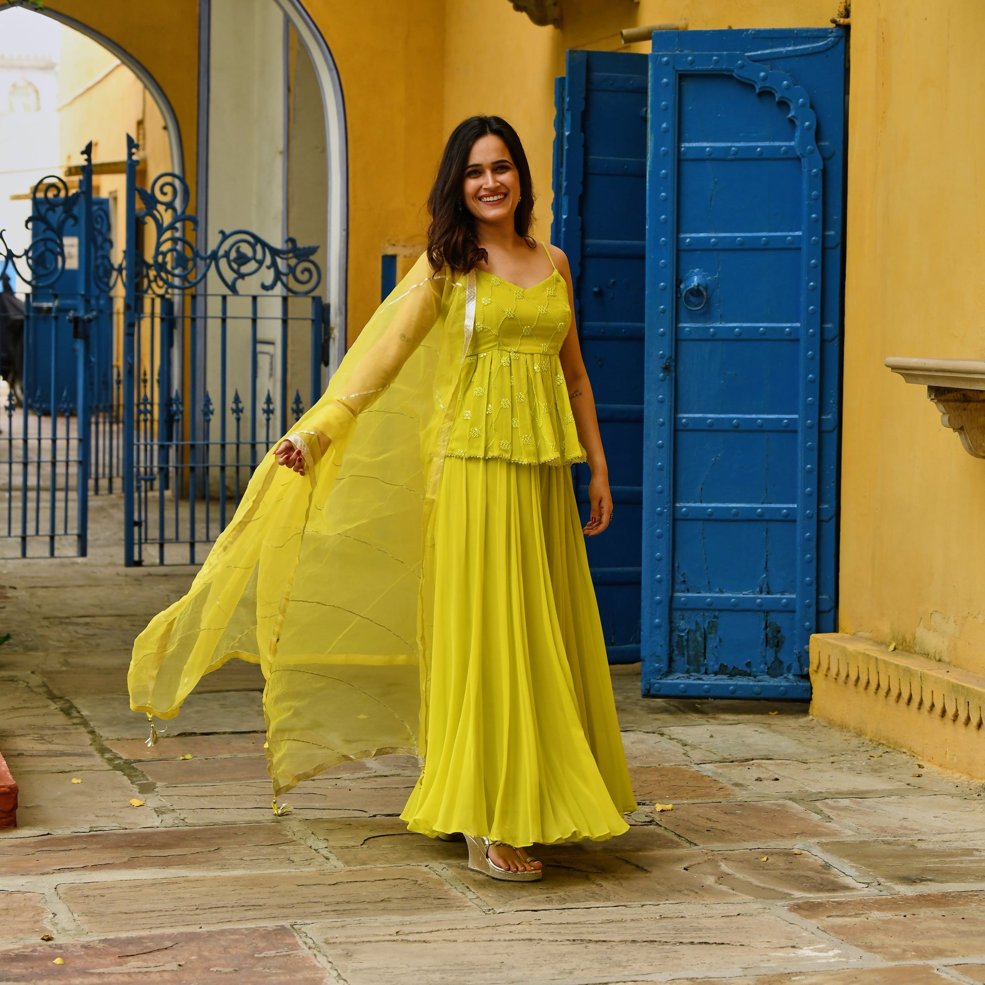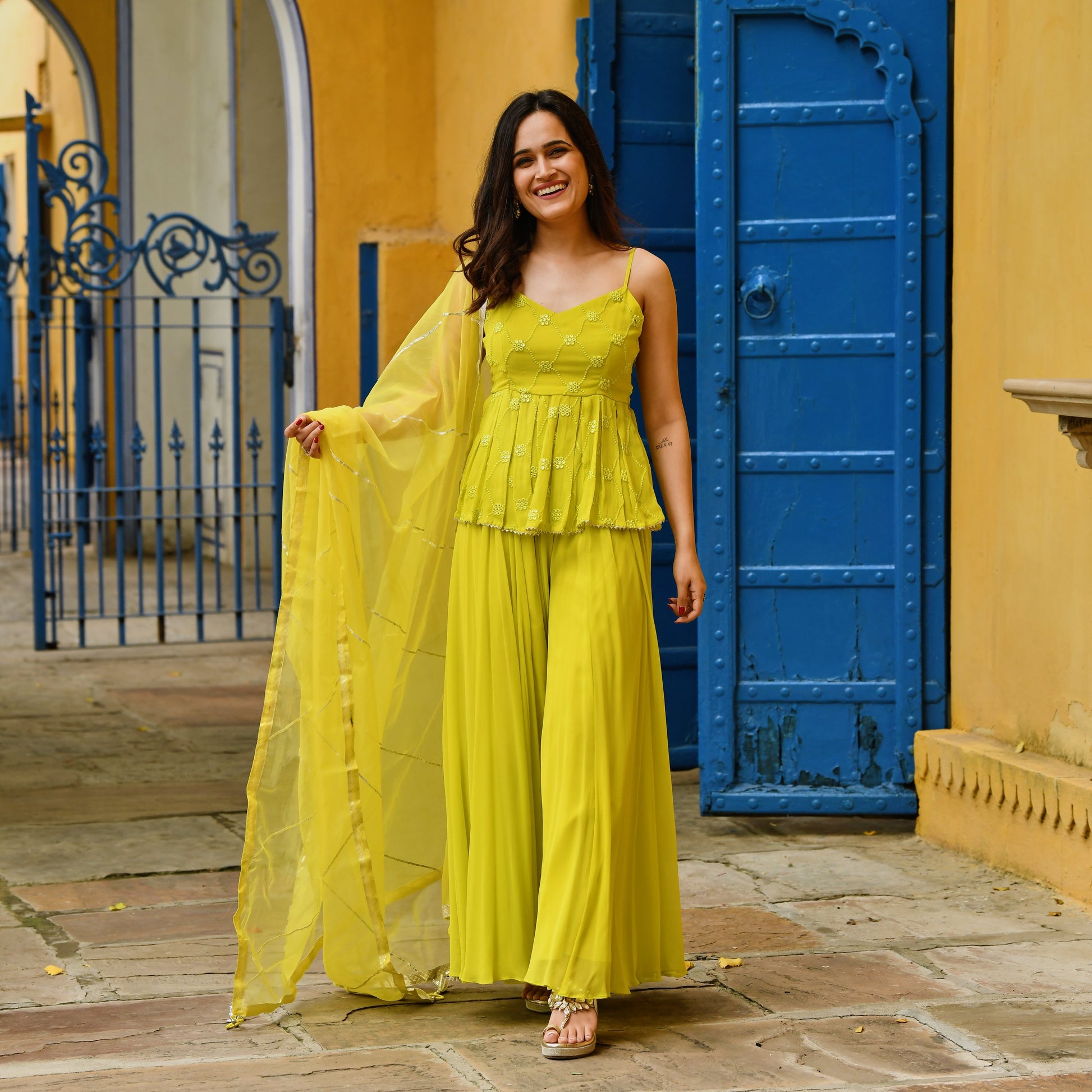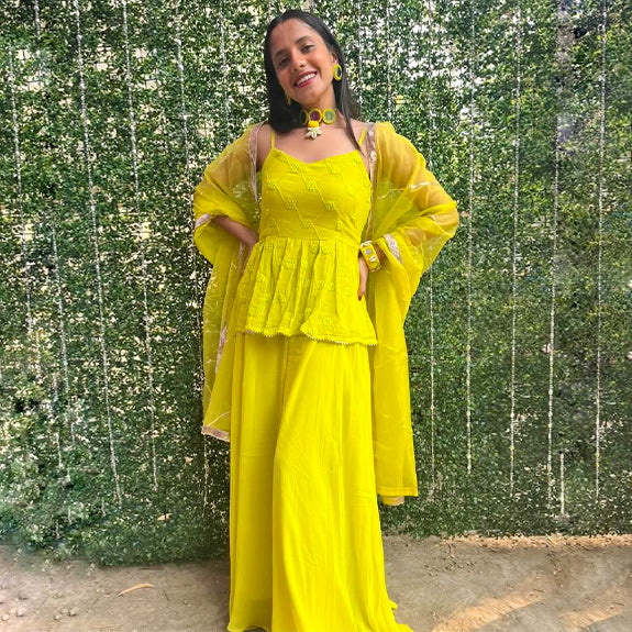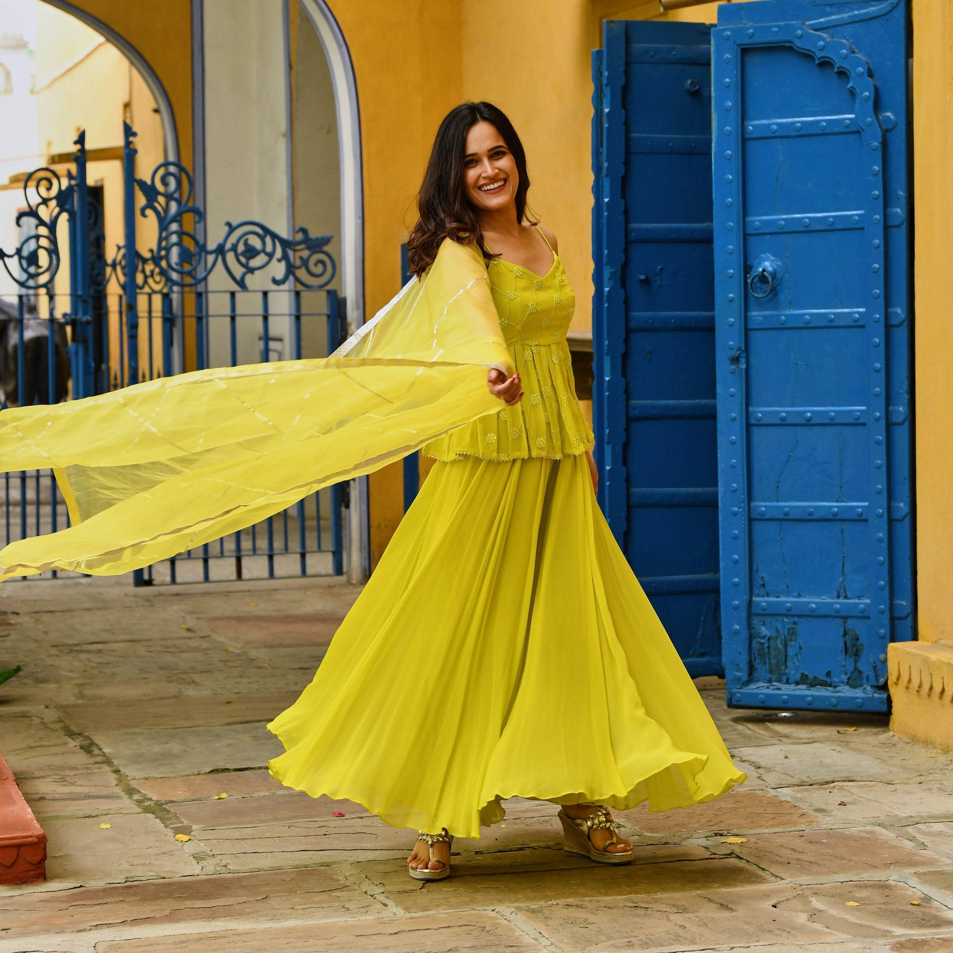 Get ready to be sufiyana in our beautiful Sufia Suit, a perfect choice to revamp your Shaadi wardrobe. The kurta top is designed to be fitted at the waist, and then flare out for a comfortable and flattering fit. Adding to the flare are the matching sharara bottoms set in the same lemon-yellow colour as the top. Completing the set is a sheer dupatta with silver borders that perfectly complement the Suit Set. The vibrant colour, the design, the georgette fabric, everything about this Suit Set is eye-catching.