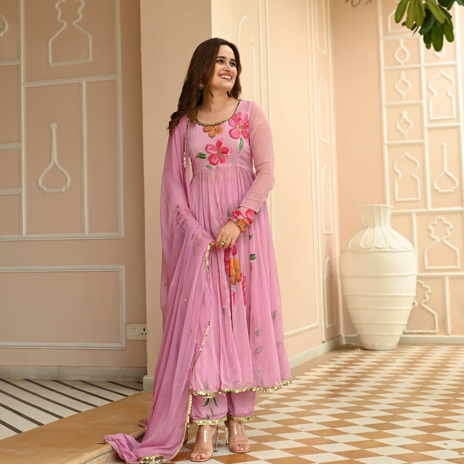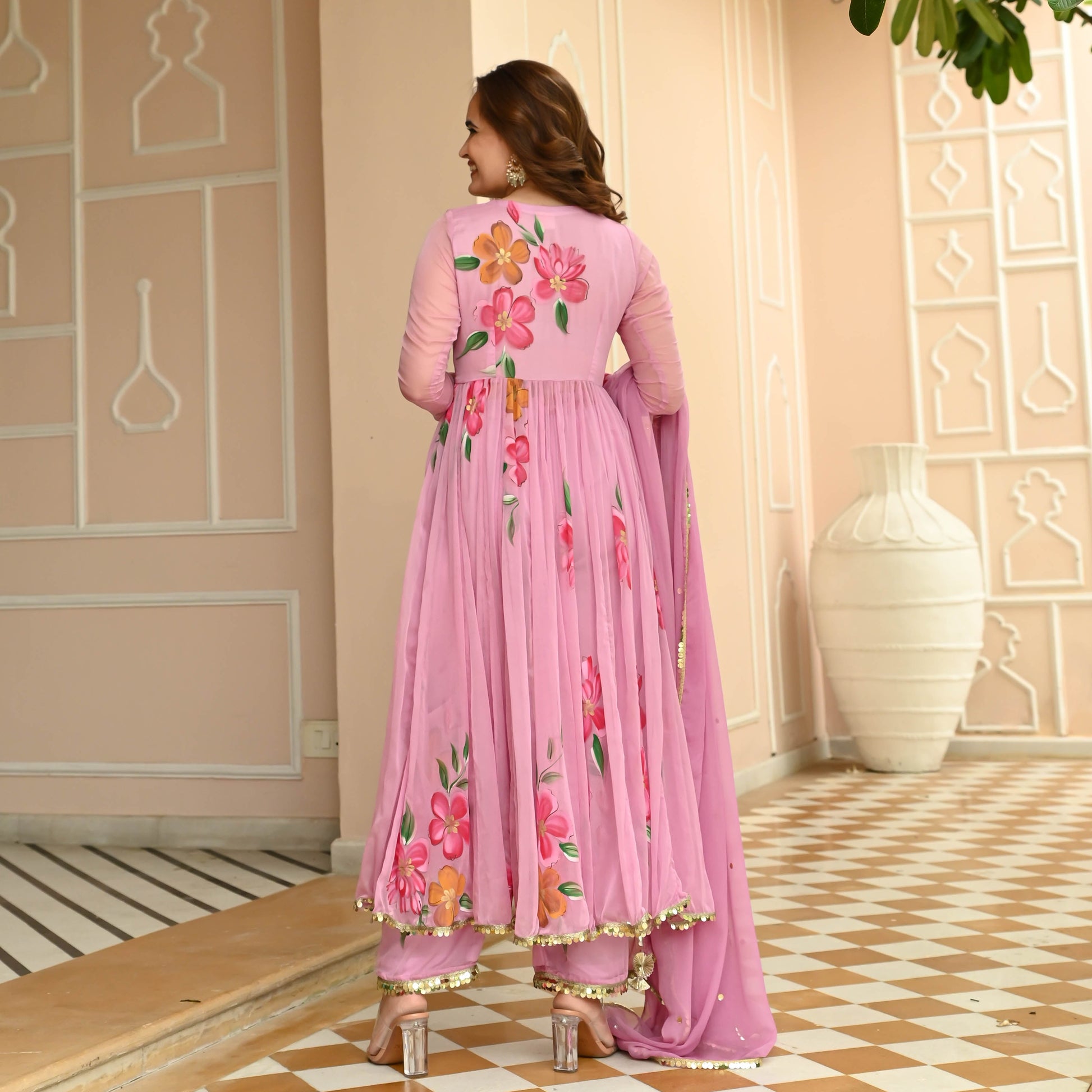 Introducing our Sugar Chiffon Handpainted Suit Set, where elegance meets artistry! Picture yourself in this enchanting ensemble, crafted from the softest muted pink chiffon, a canvas for nature's beauty. Handpainted flowers delicately dance across the fabric, bringing a whimsical touch to your style.