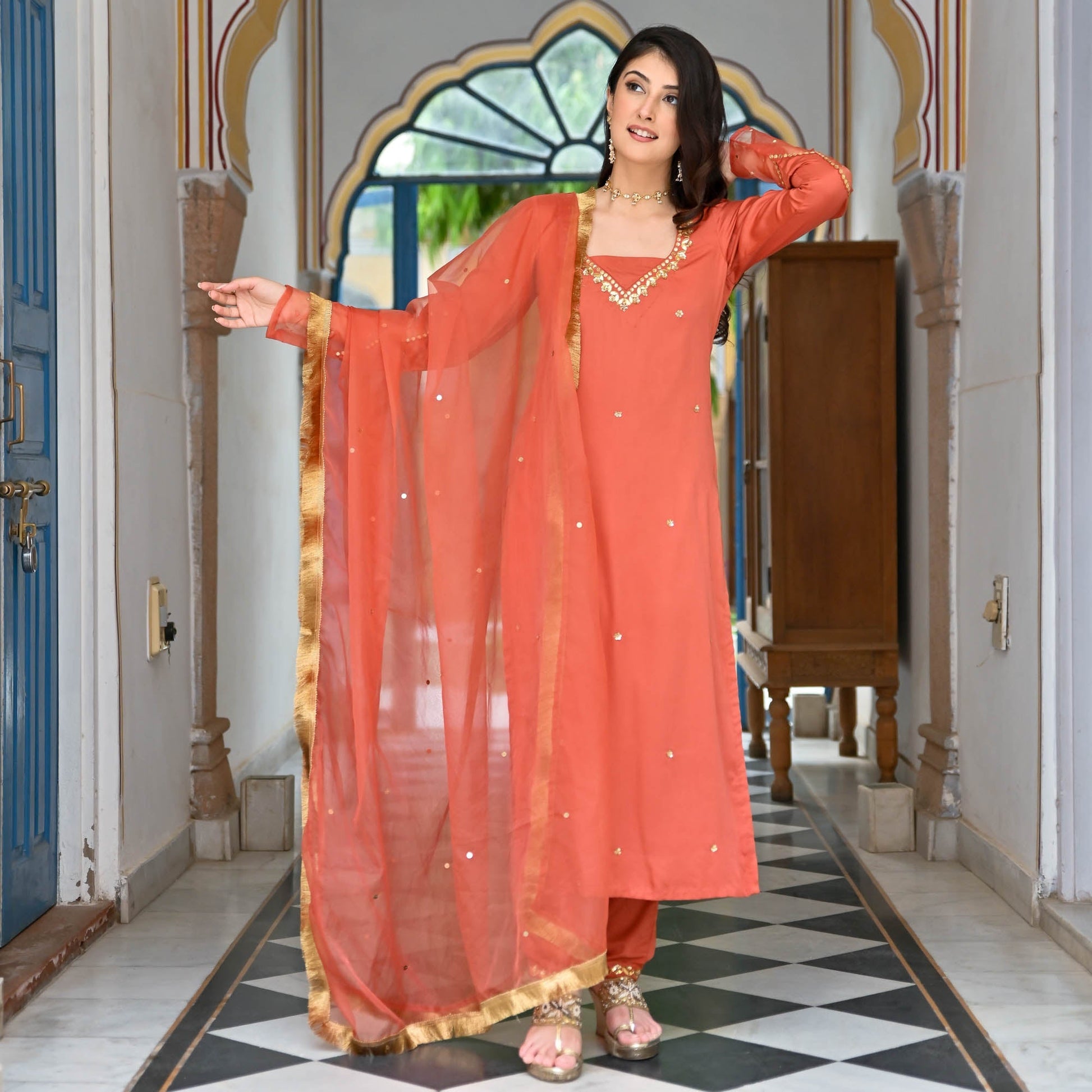 Introducing our Surkh Suit Set, a dream ensemble crafted from luxurious coral satin fabric. This exquisite creation is adorned with intricate sequin and cut-dana work, creating a dazzling effect that will leave everyone in awe. Complete with a matching organza dupatta, this ensemble is a perfect choice for those seeking to make a statement on special occasions.