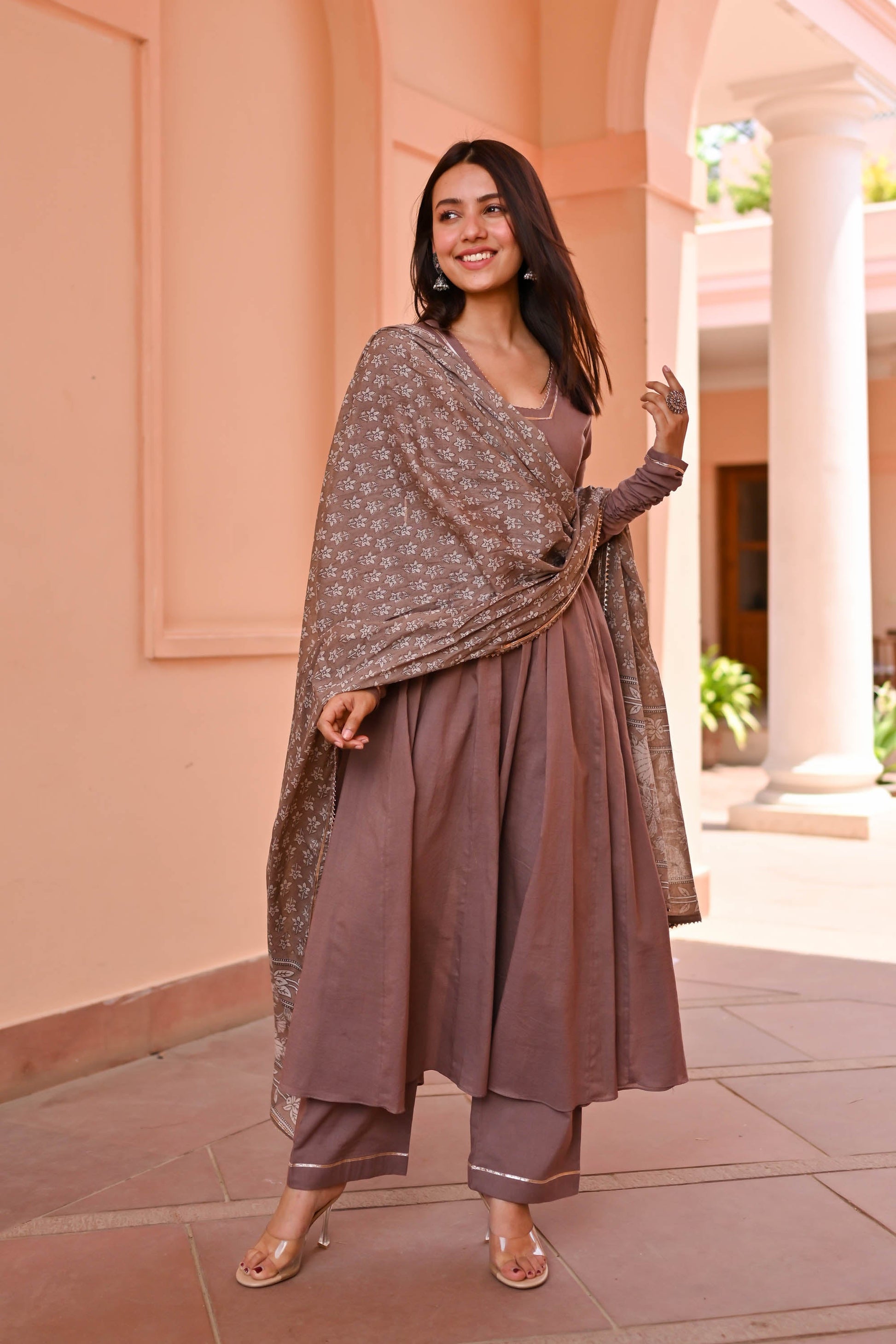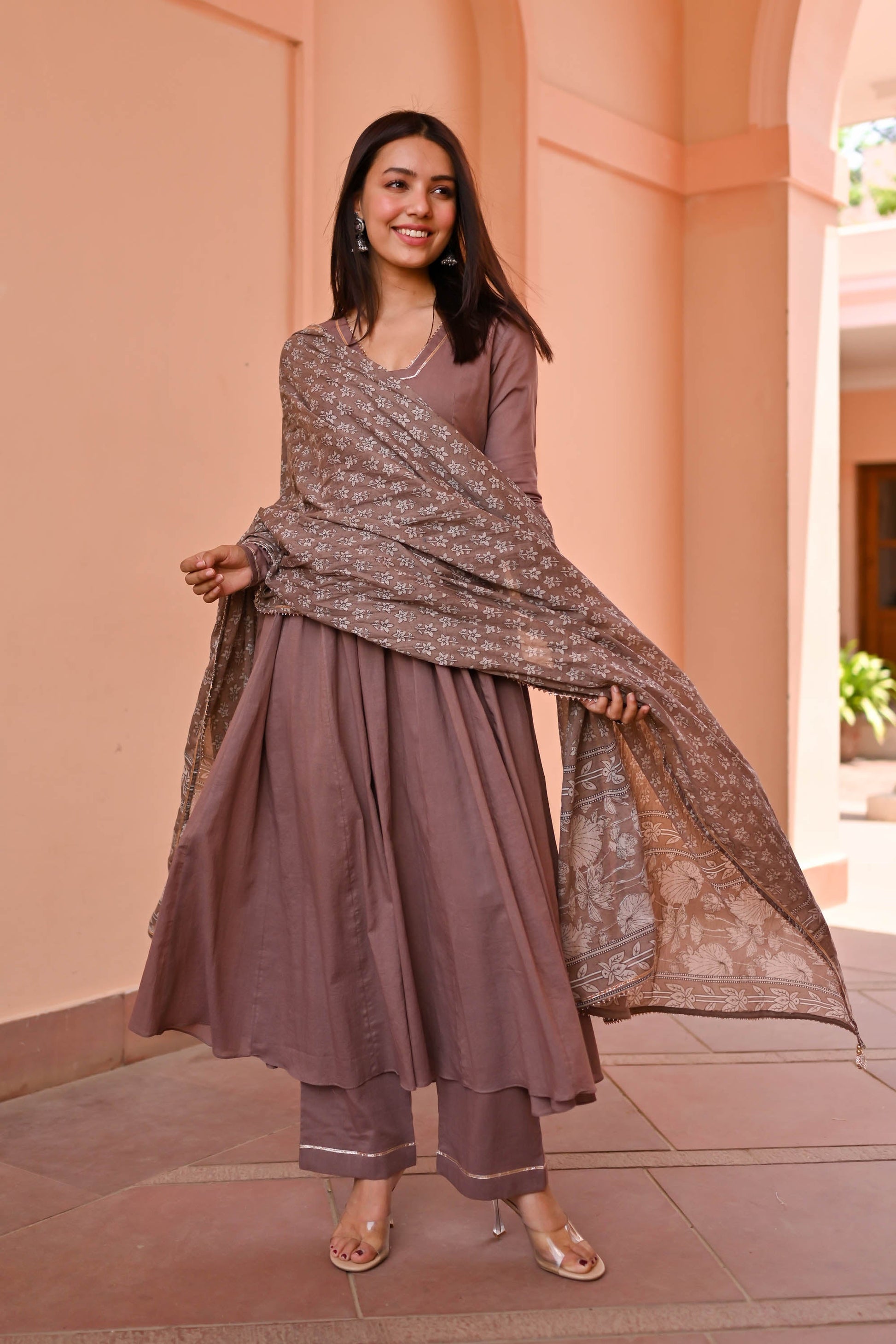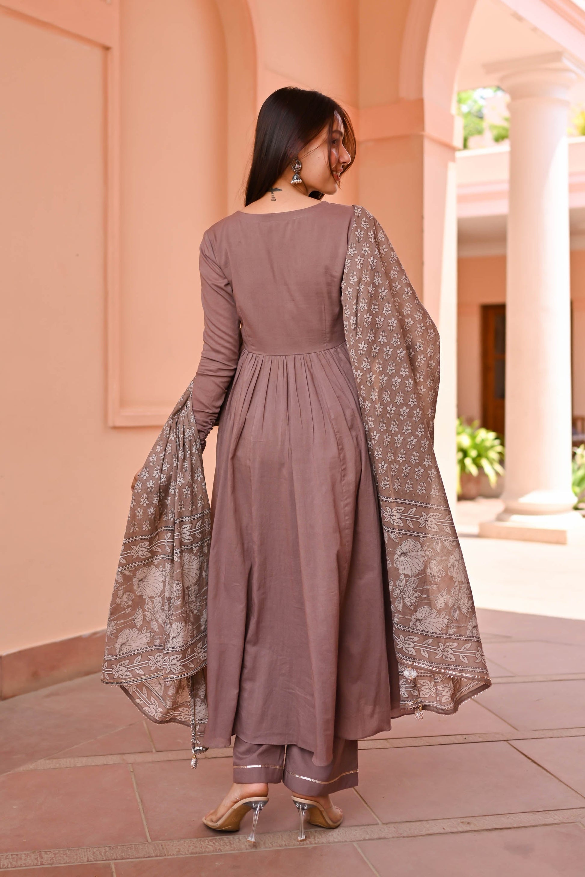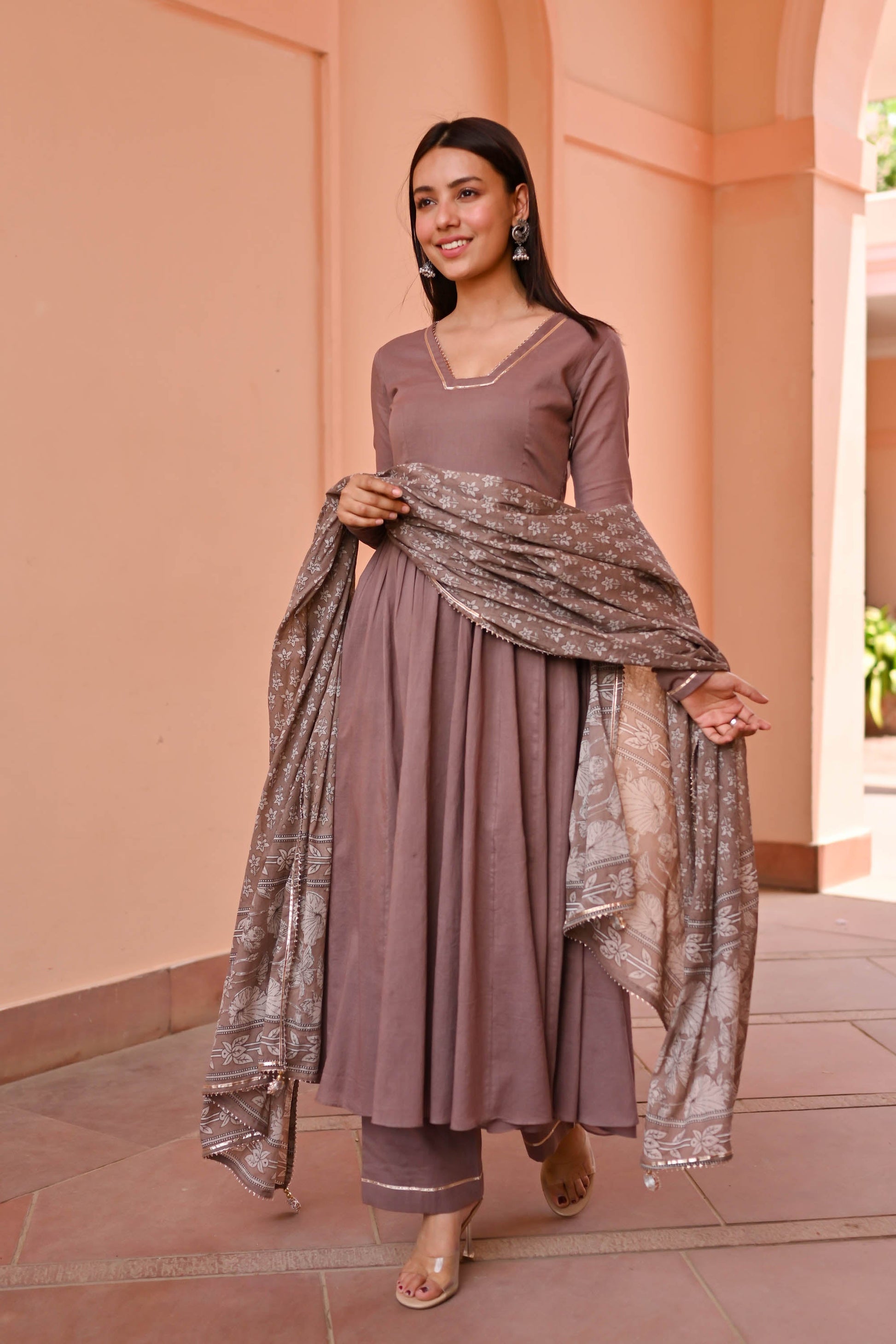 Discover sophistication with the Vedika Trio Cotton Suit Set. Meticulously crafted from luxurious cotton, its earthy brown tones evoke timeless charm. The flared kurta boasts a V-neck adorned with delicate lace detailing and pleated full sleeves, exuding elegance. Paired with matching pants and a printed dupatta featuring ethnic motifs, this ensemble promises effortless style for any occasion.