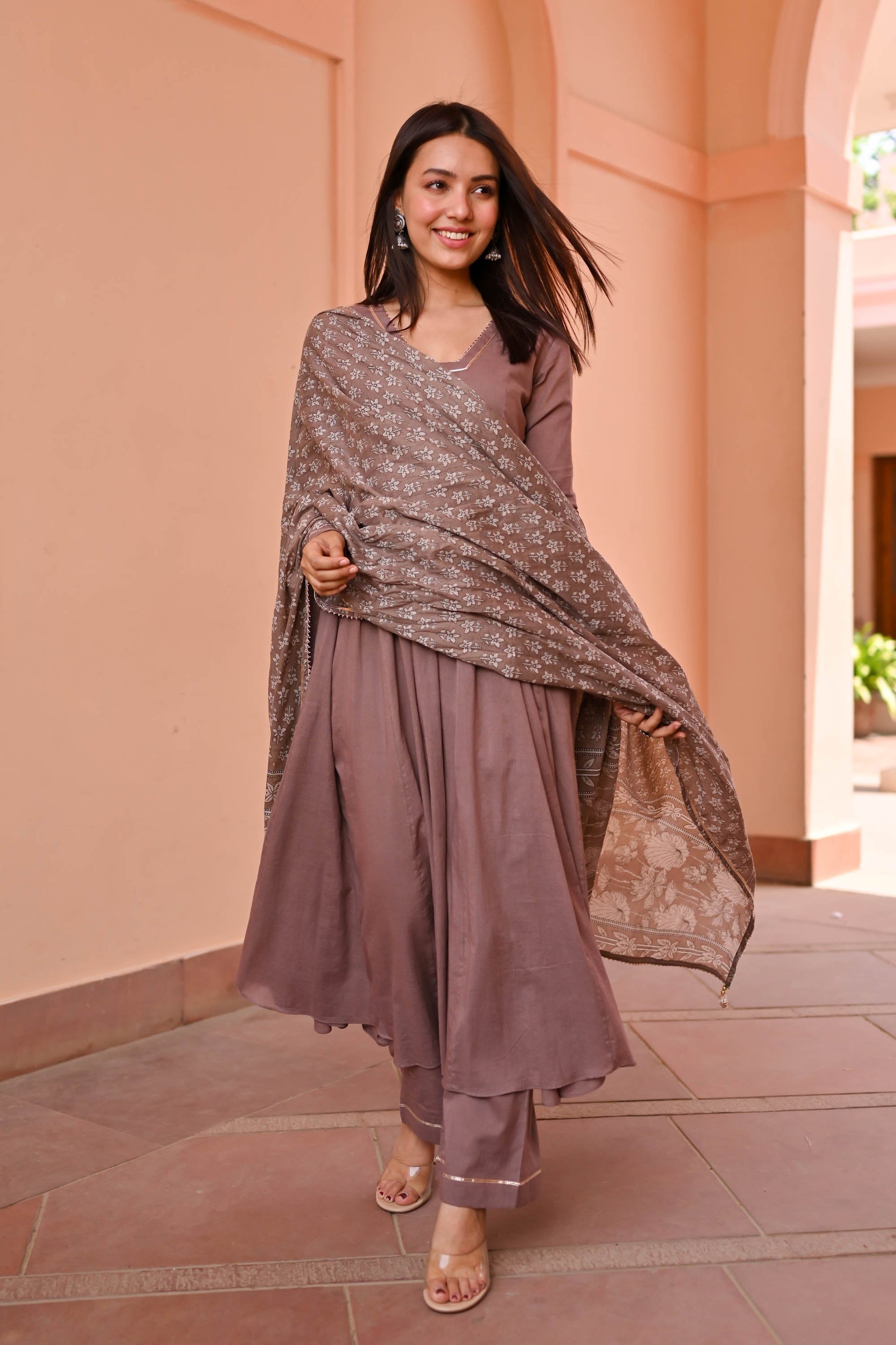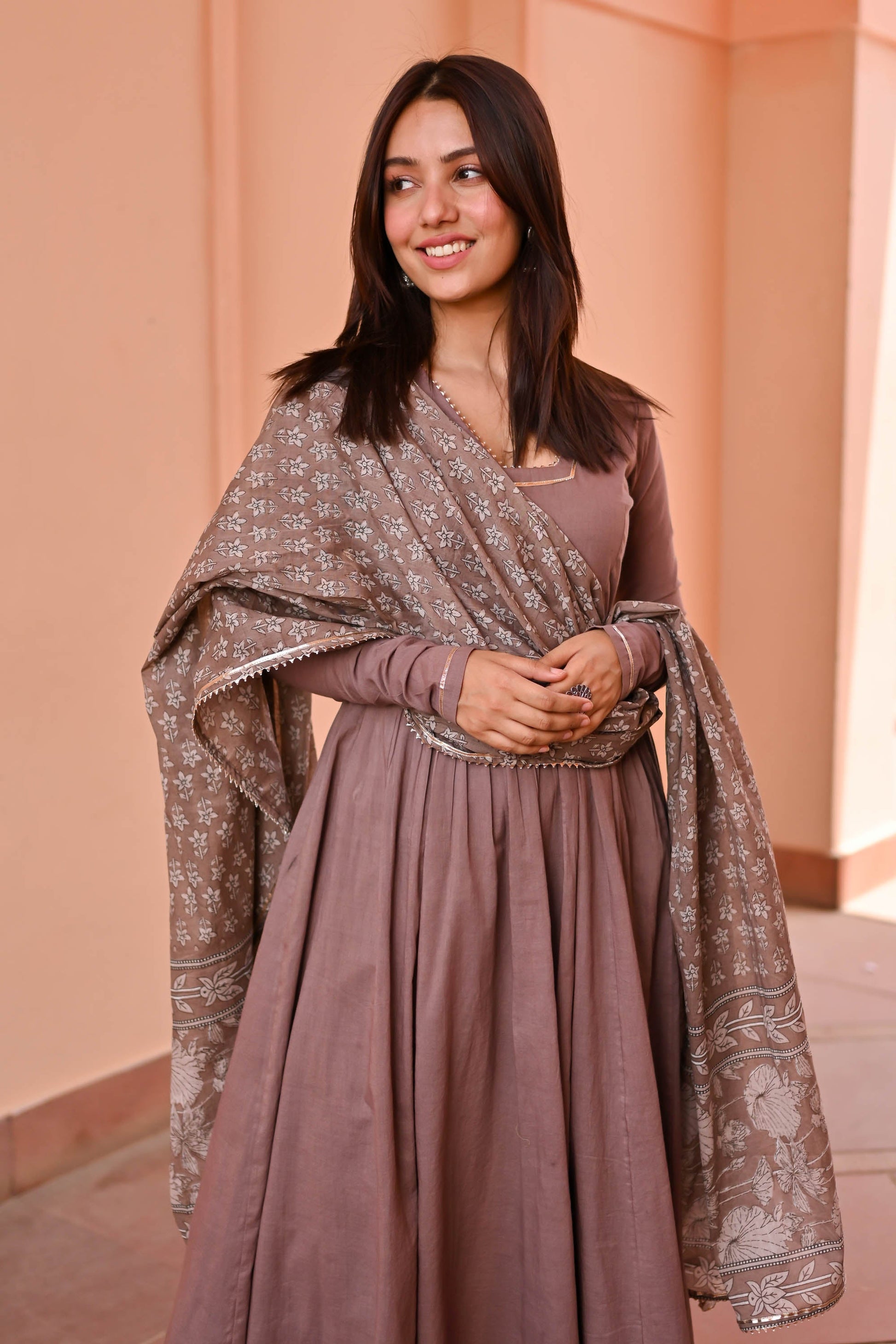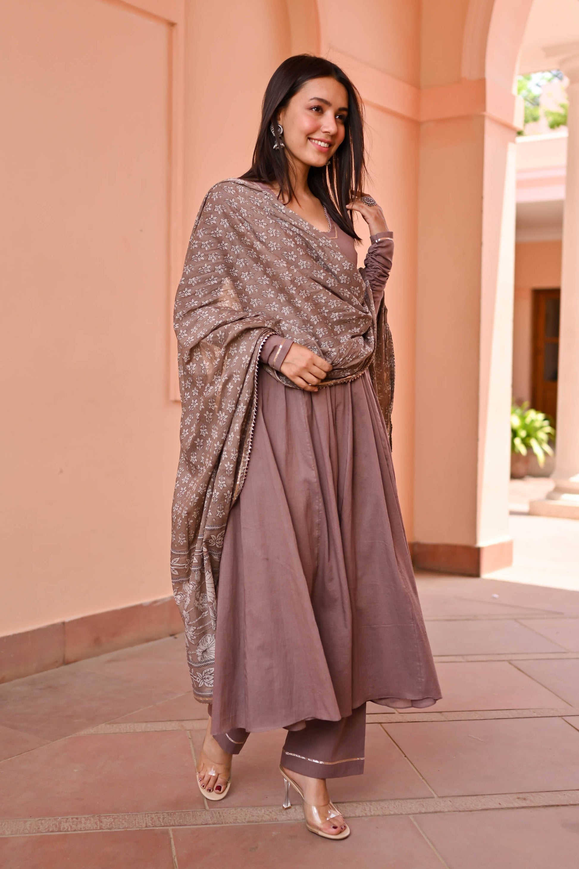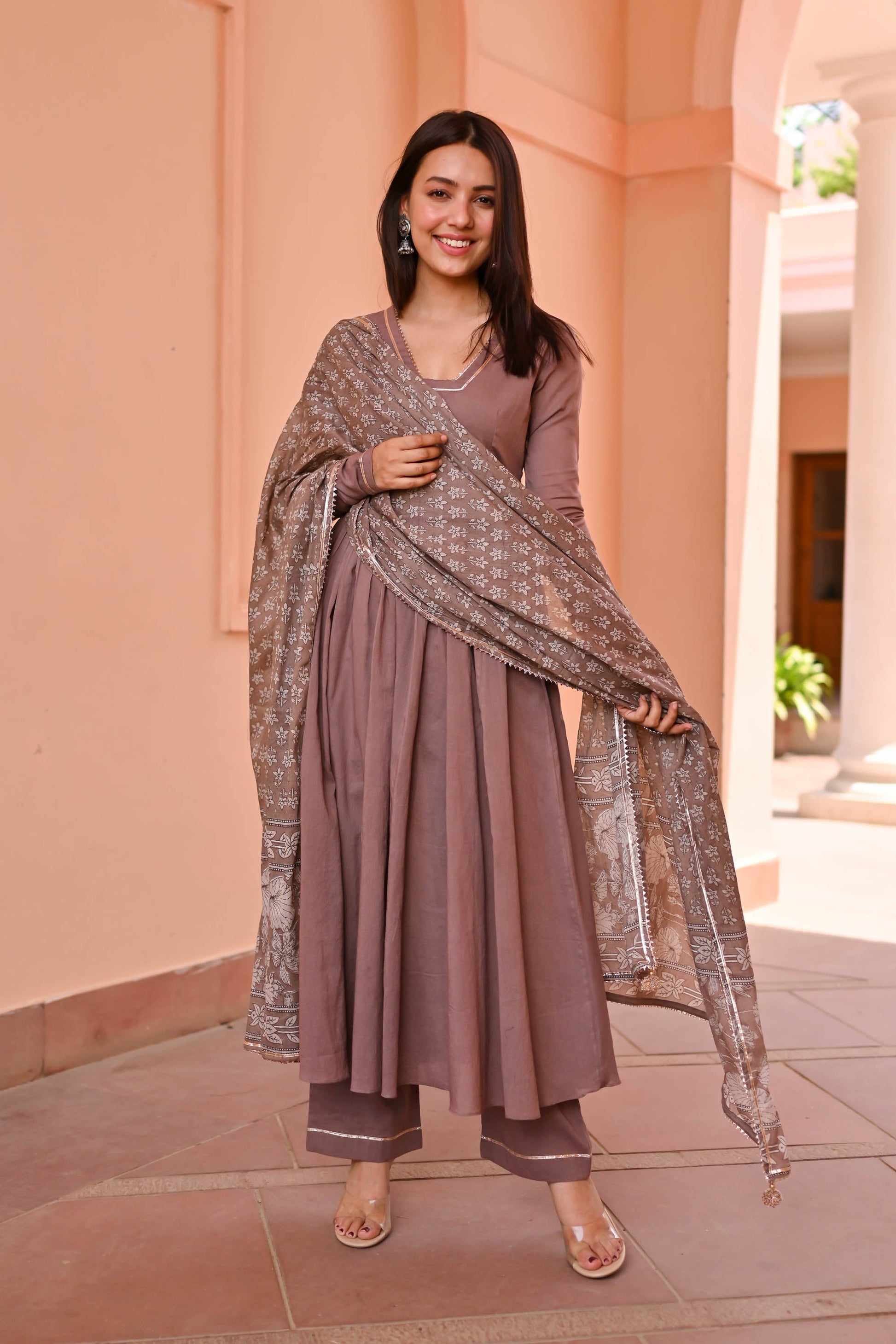 Discover sophistication with the Vedika Trio Cotton Suit Set. Meticulously crafted from luxurious cotton, its earthy brown tones evoke timeless charm. The flared kurta boasts a V-neck adorned with delicate lace detailing and pleated full sleeves, exuding elegance. Paired with matching pants and a printed dupatta featuring ethnic motifs, this ensemble promises effortless style for any occasion.