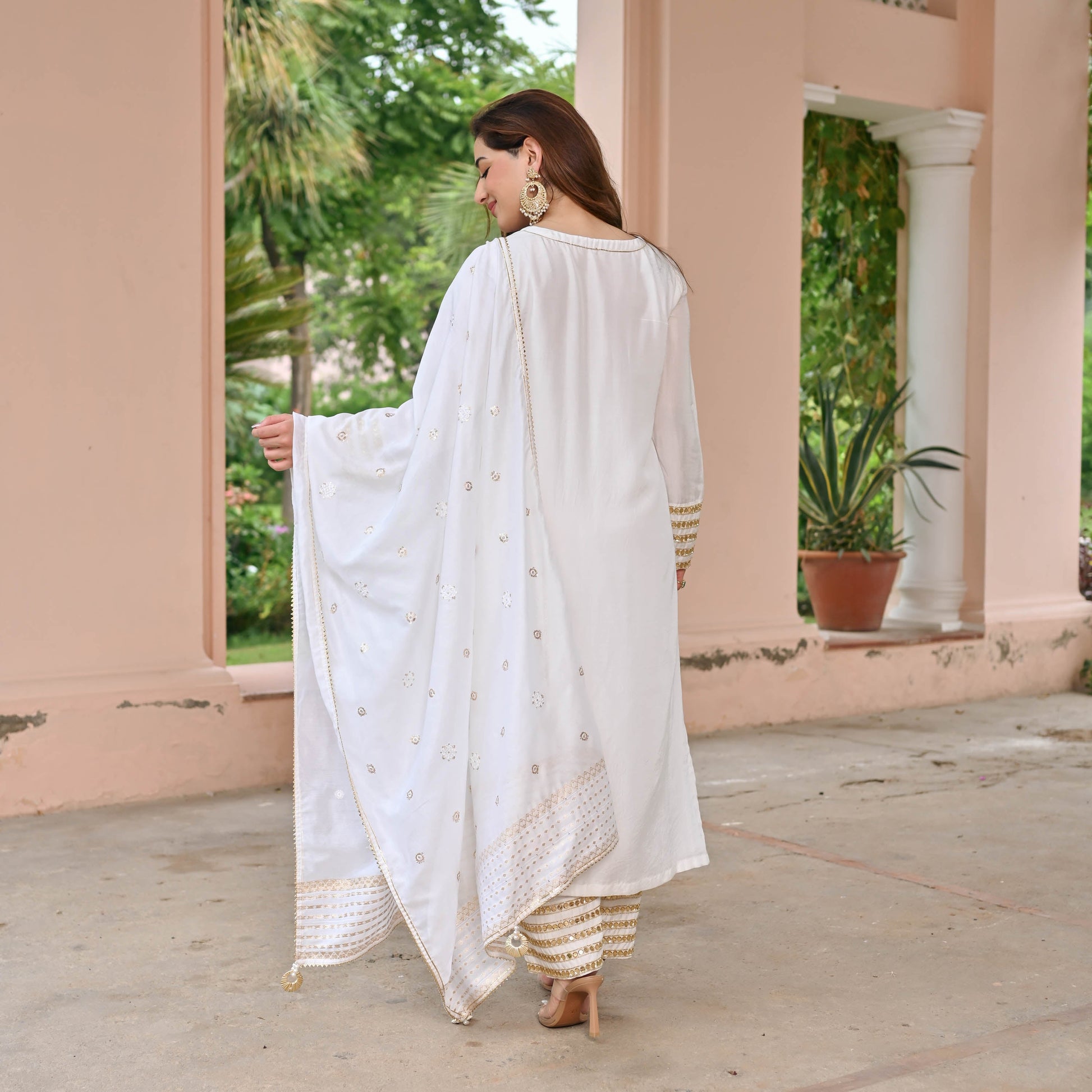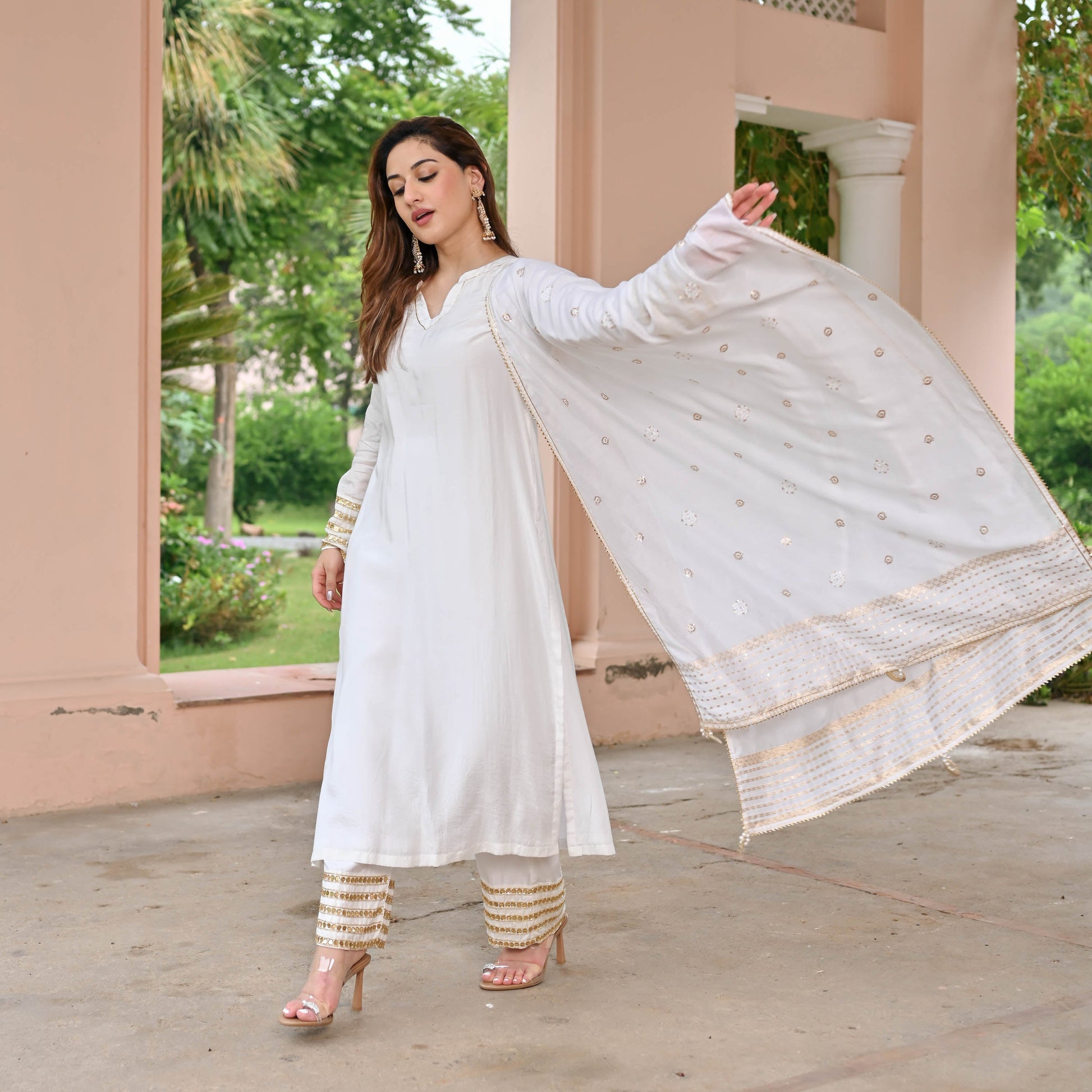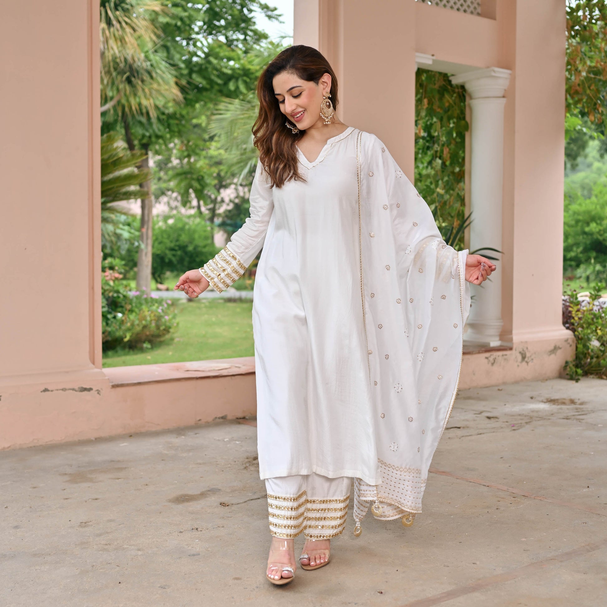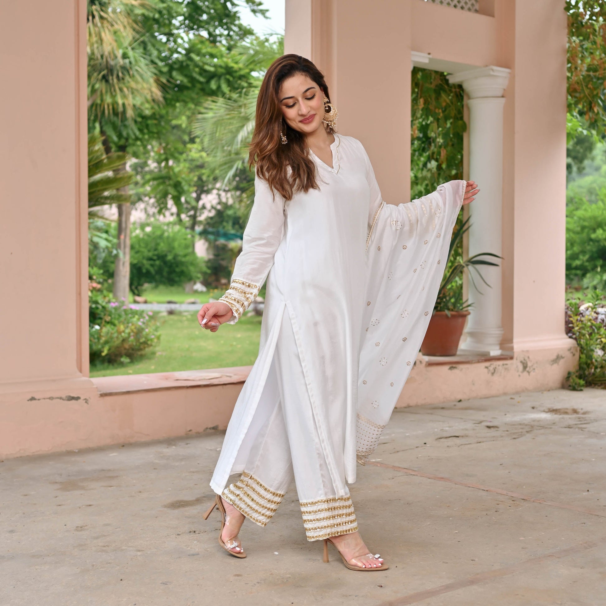 Discover timeless elegance with the White Glitter Gold Suit Set. The serene white hue is accentuated by luxurious cotton silk fabric. This set features a solid straight kurta with a V-neckline and full sleeves adorned with embellishments on the hems. Complemented by matching pants with sequin-embellished hems and a fully embellished dupatta, it’s perfect for any refined occasion.