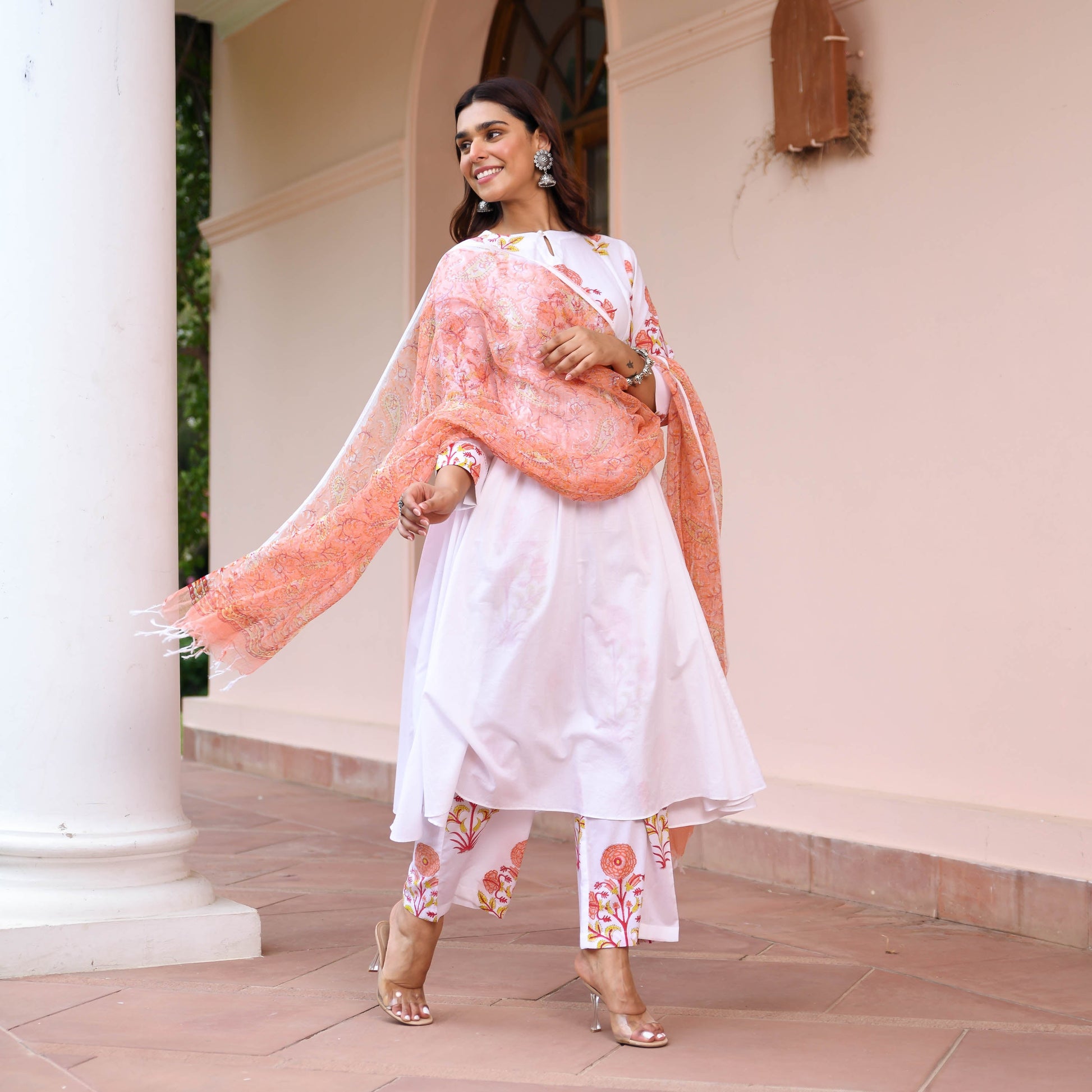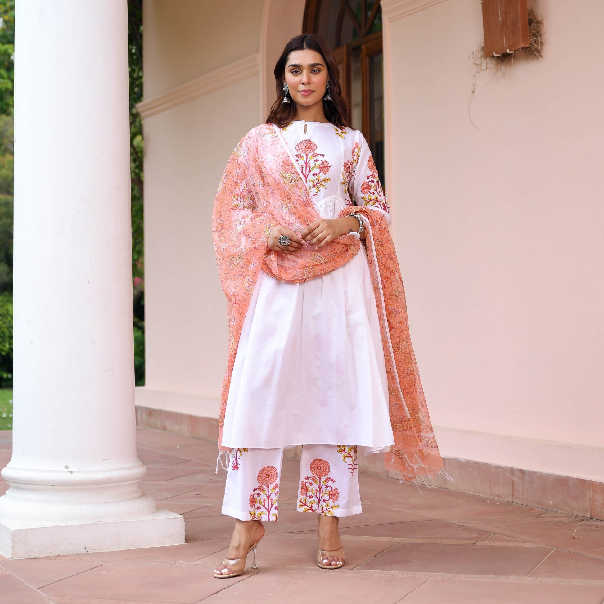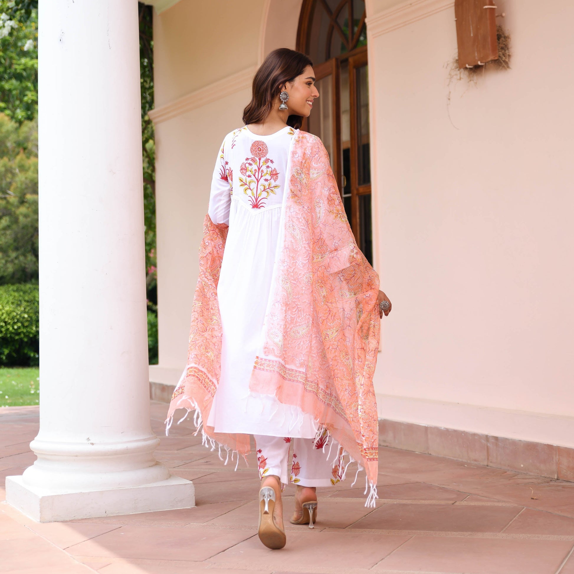The White Suit with Printed Dupatta showcases plush white cotton in a flared A-line fit, featuring a block-printed front yoke and three-quarter sleeves with a stylish round neck and keyhole detail. Paired with matching block-printed pants, it’s complemented by an ethnic motif printed kota doriya dupatta. This elegant ensemble is perfect for a chic, festive look.