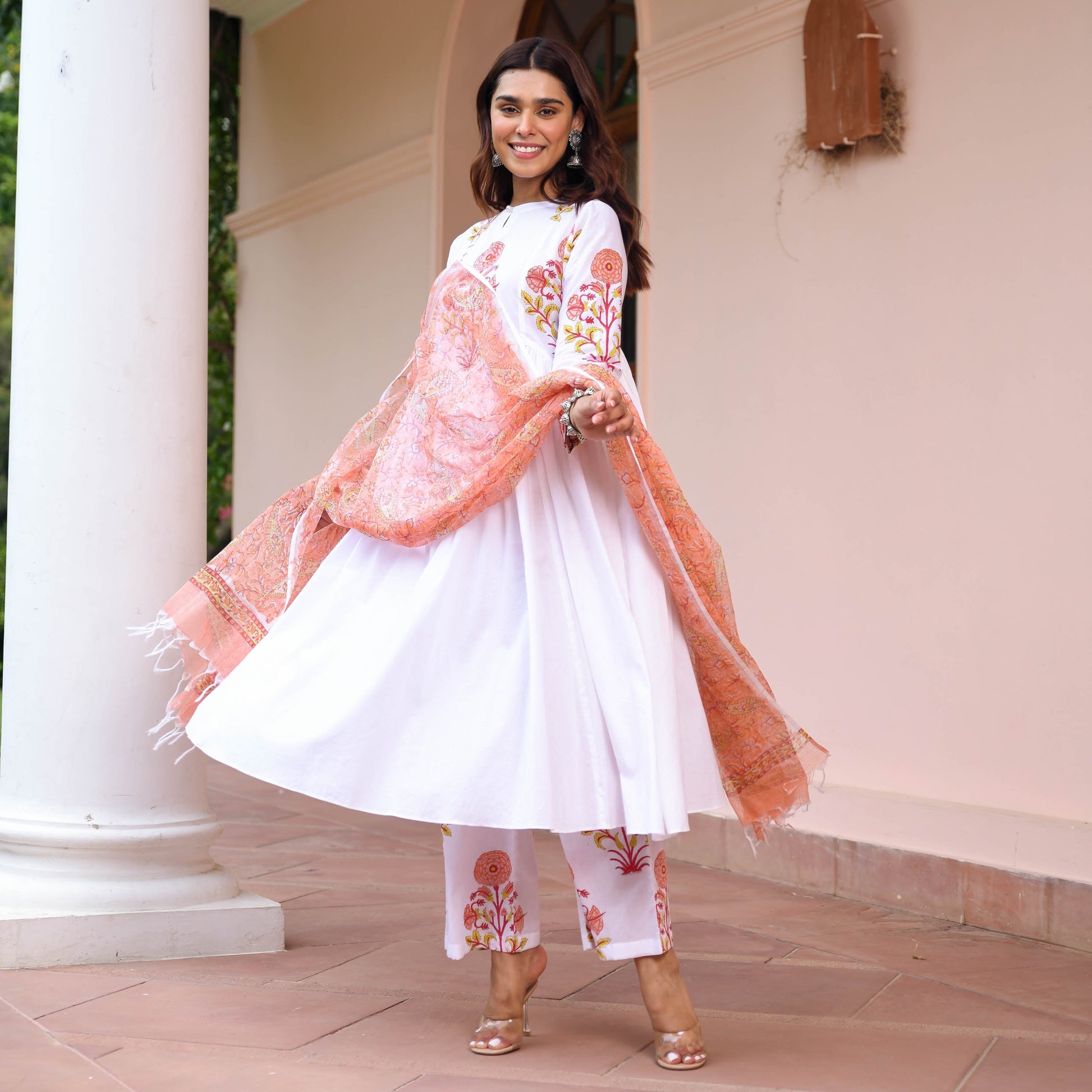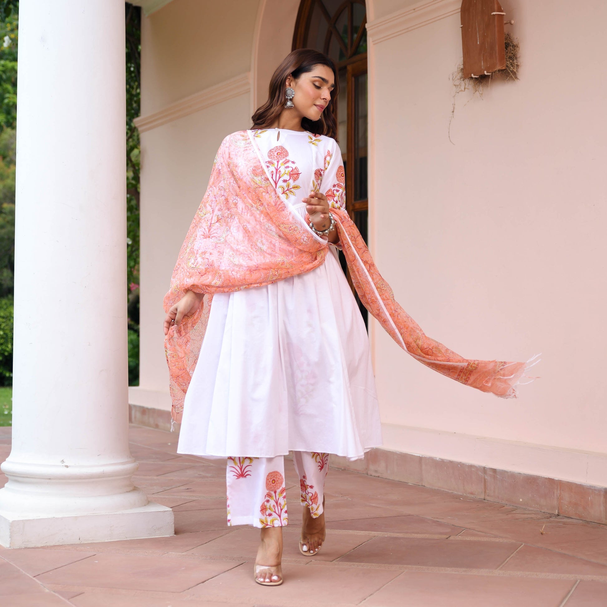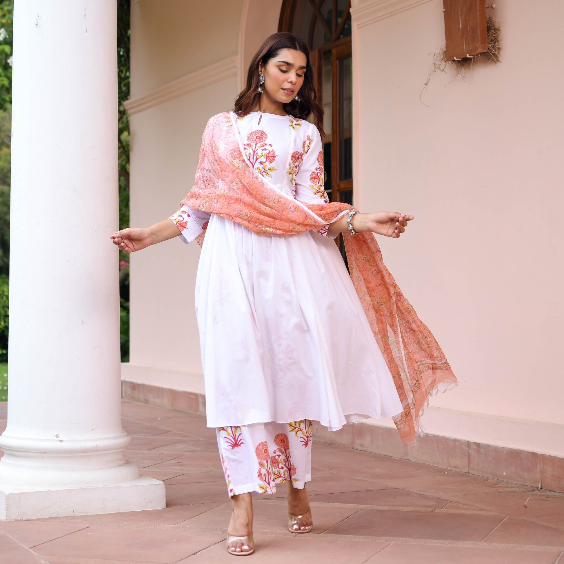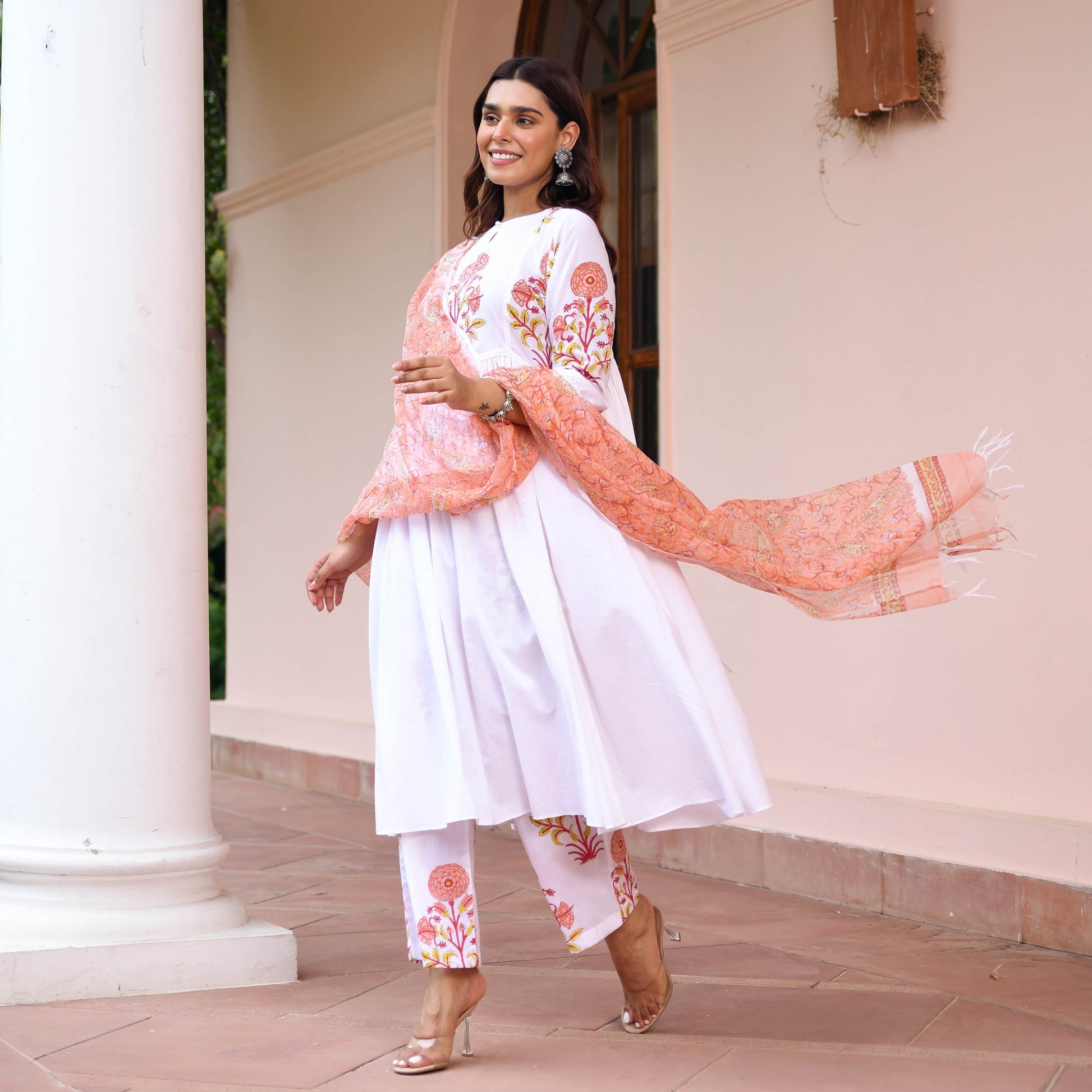The White Suit with Printed Dupatta showcases plush white cotton in a flared A-line fit, featuring a block-printed front yoke and three-quarter sleeves with a stylish round neck and keyhole detail. Paired with matching block-printed pants, it’s complemented by an ethnic motif printed kota doriya dupatta. This elegant ensemble is perfect for a chic, festive look.