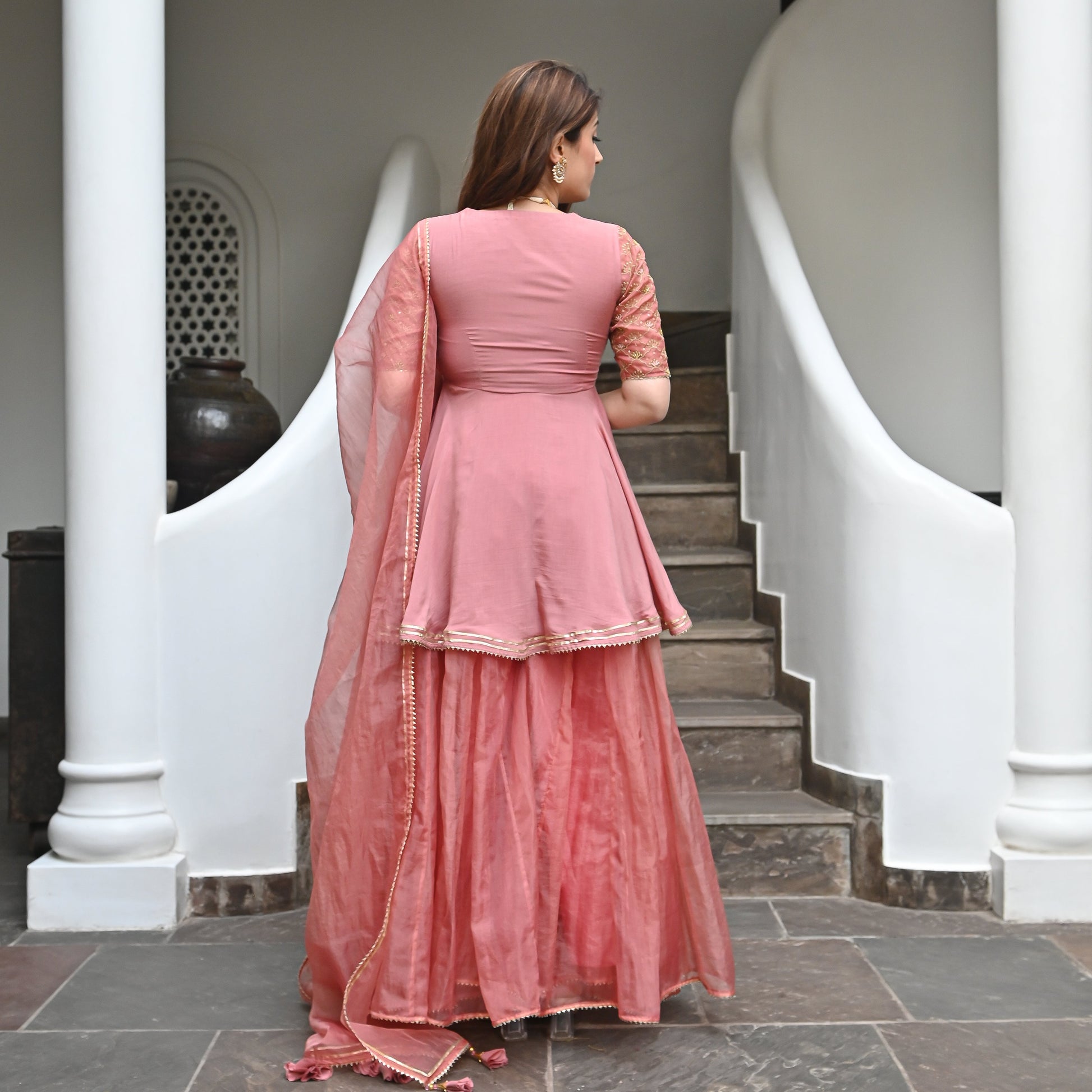 Introducing our Yasmeen Suit Set, a stunning piece that exudes elegance and sophistication. The highlight of this outfit is the intricate handwork on the bodice, which is done using zardozi embroidery and adds a touch of royalty and grandeur to the outfit. The gotta border on the dupatta and the hemline of the top further accentuates the traditional design of the outfit. The soft peach colour of the outfit is perfect for any special occasion and is sure to make you feel graceful and sophisticated.
