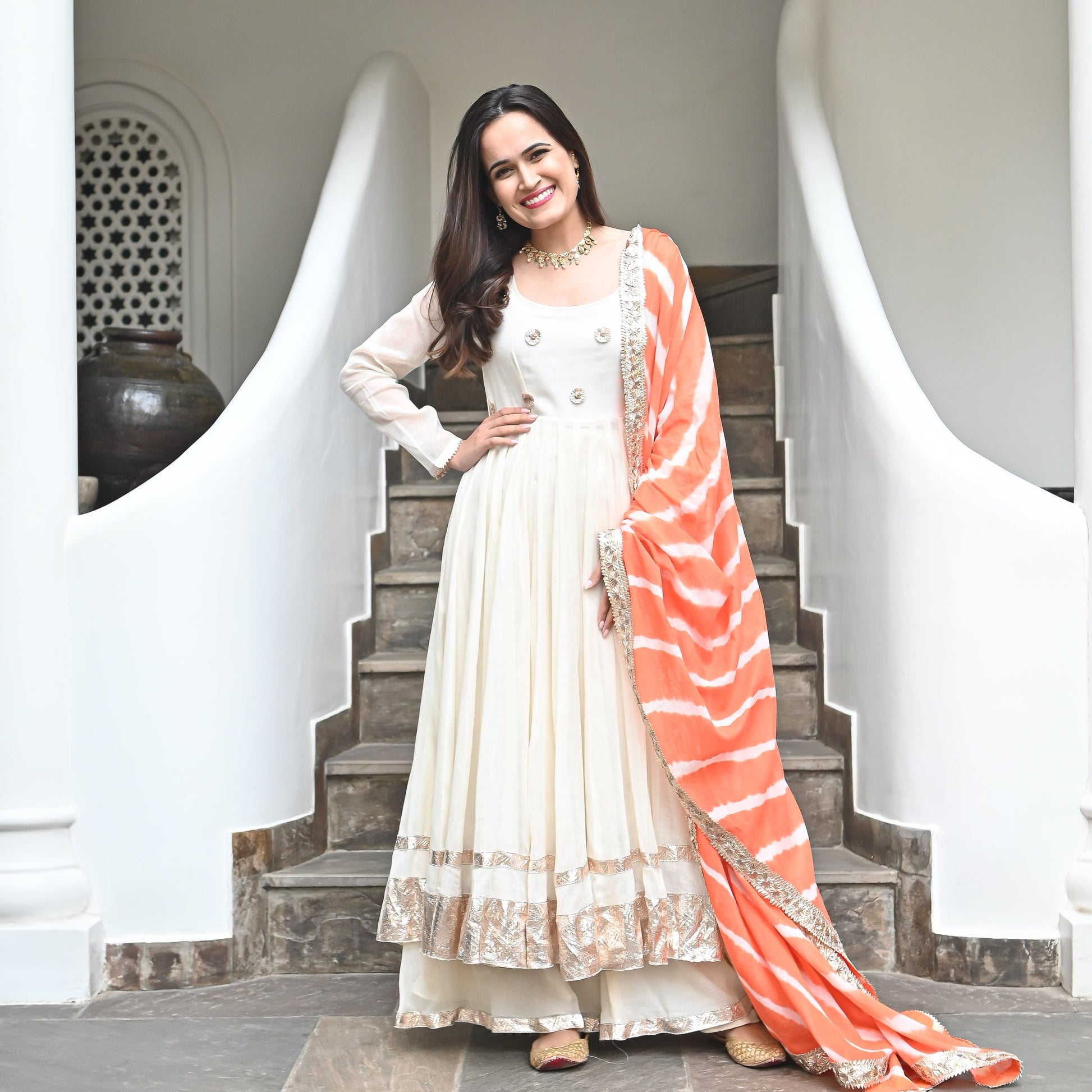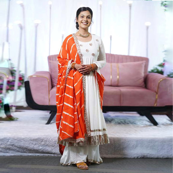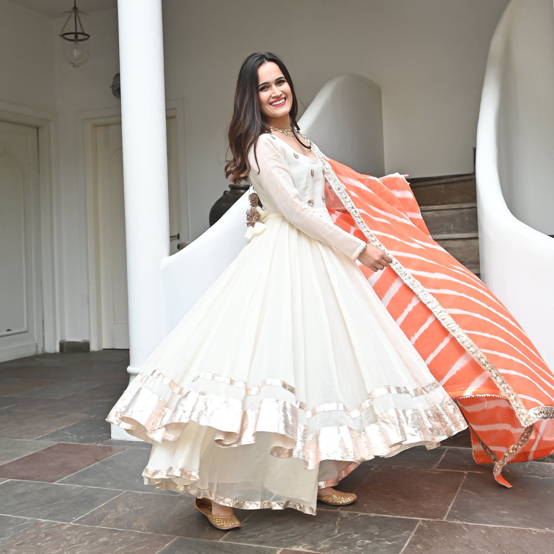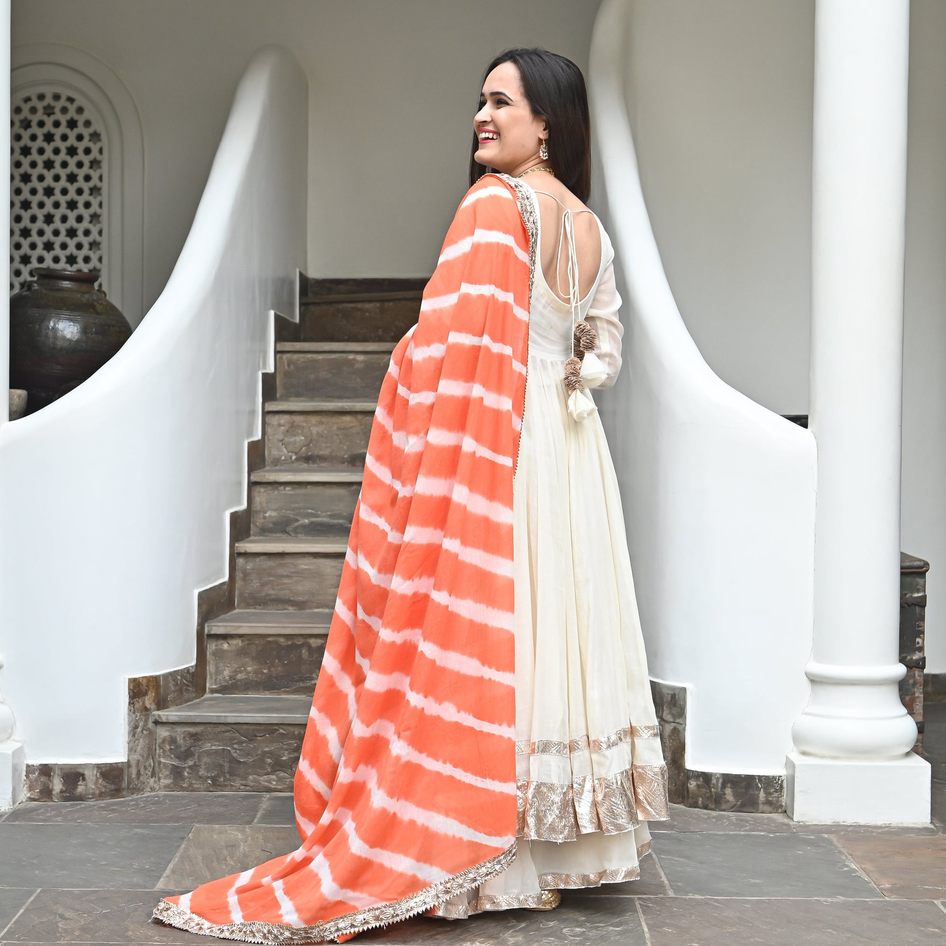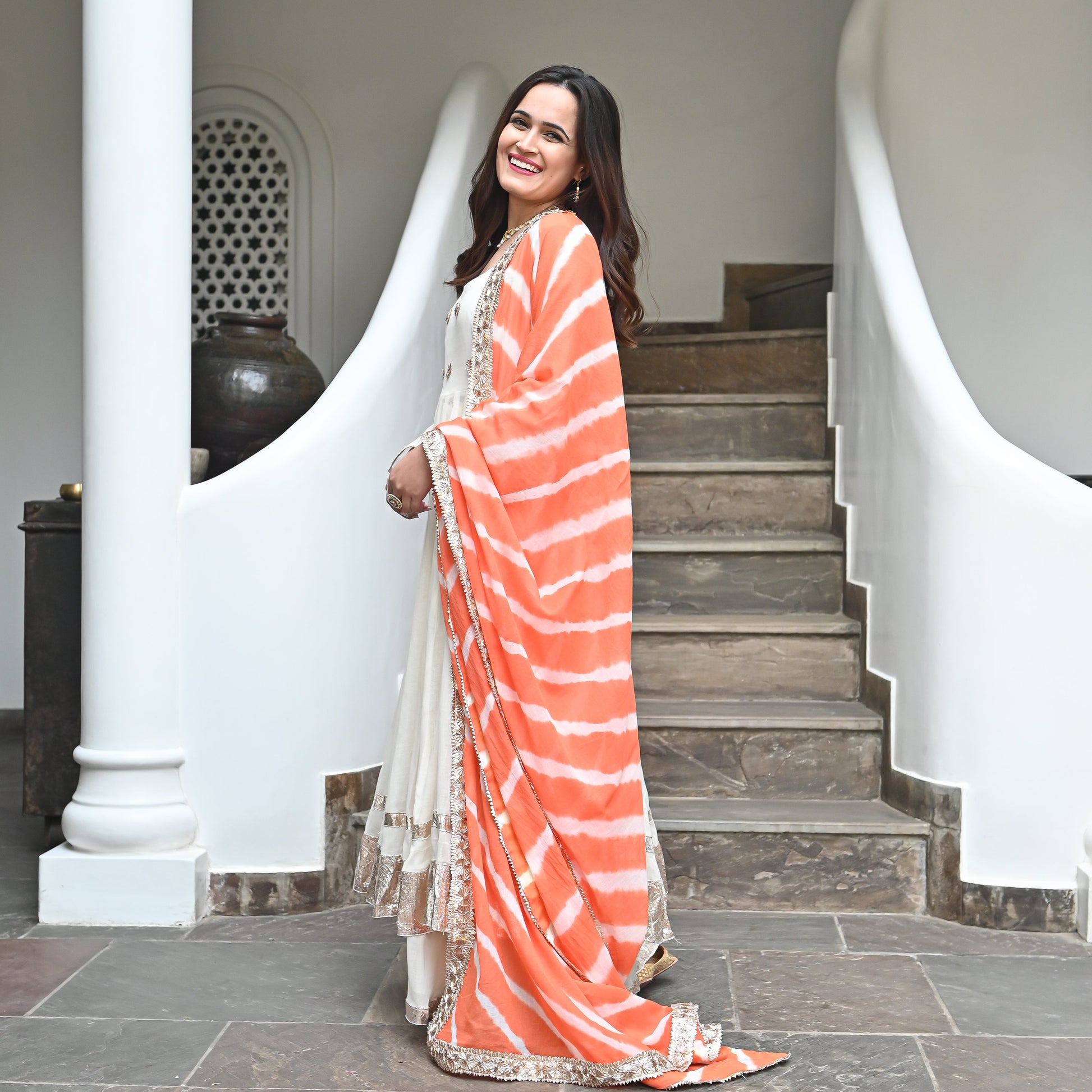 This Zeina Suit Set is a beautiful and elegant traditional Indian outfit that is perfect for any festive occasion. The Suit Set features soft and lightweight white mulmul fabric along with long sleeves and a round neckline. The Set is also adorned with intricate gold details that add a touch of glamour to the garment. The Set has a flared silhouette that creates a beautiful and graceful drape, paired with an orange tie-dye dupatta which adds a vibrant pop of colour to the outfit.