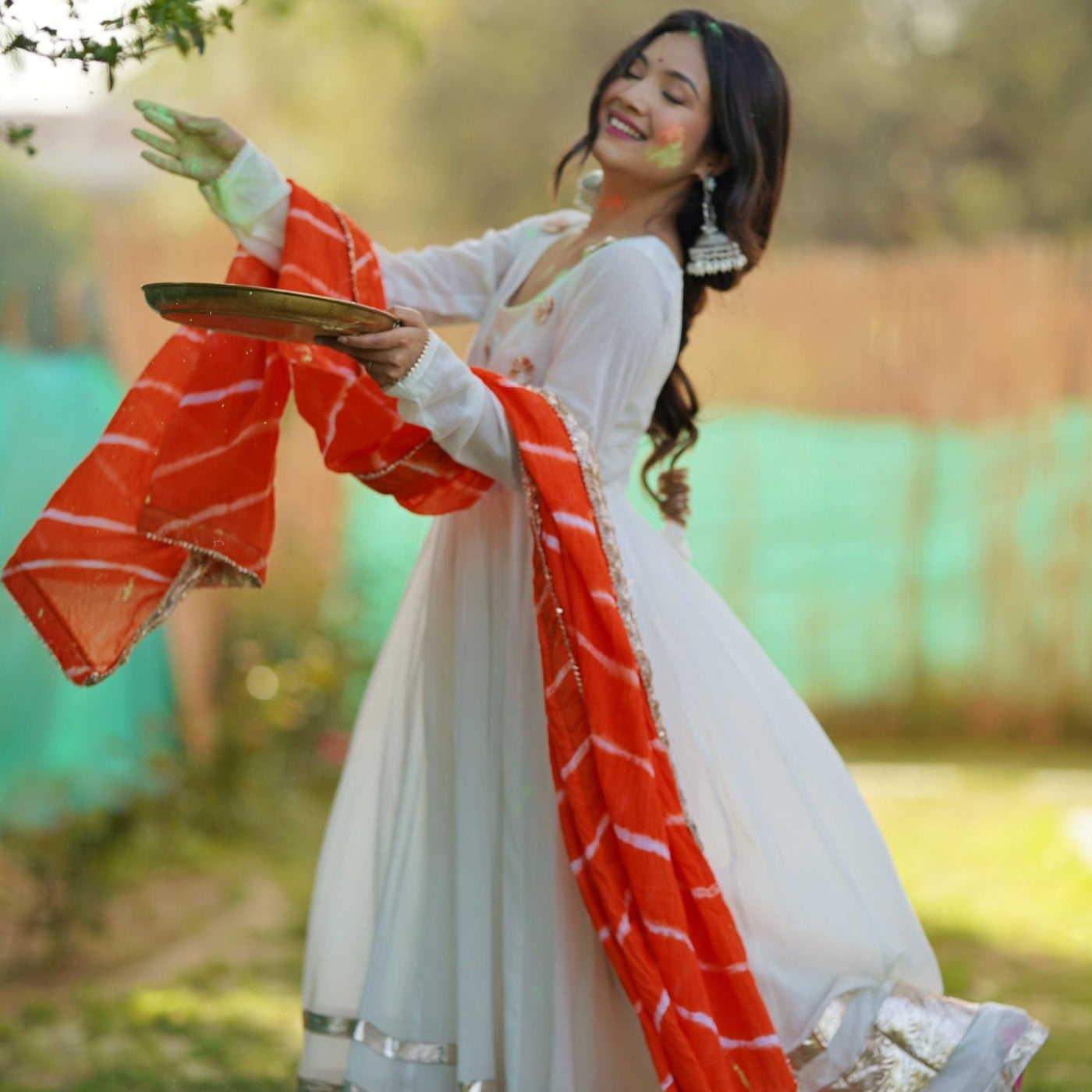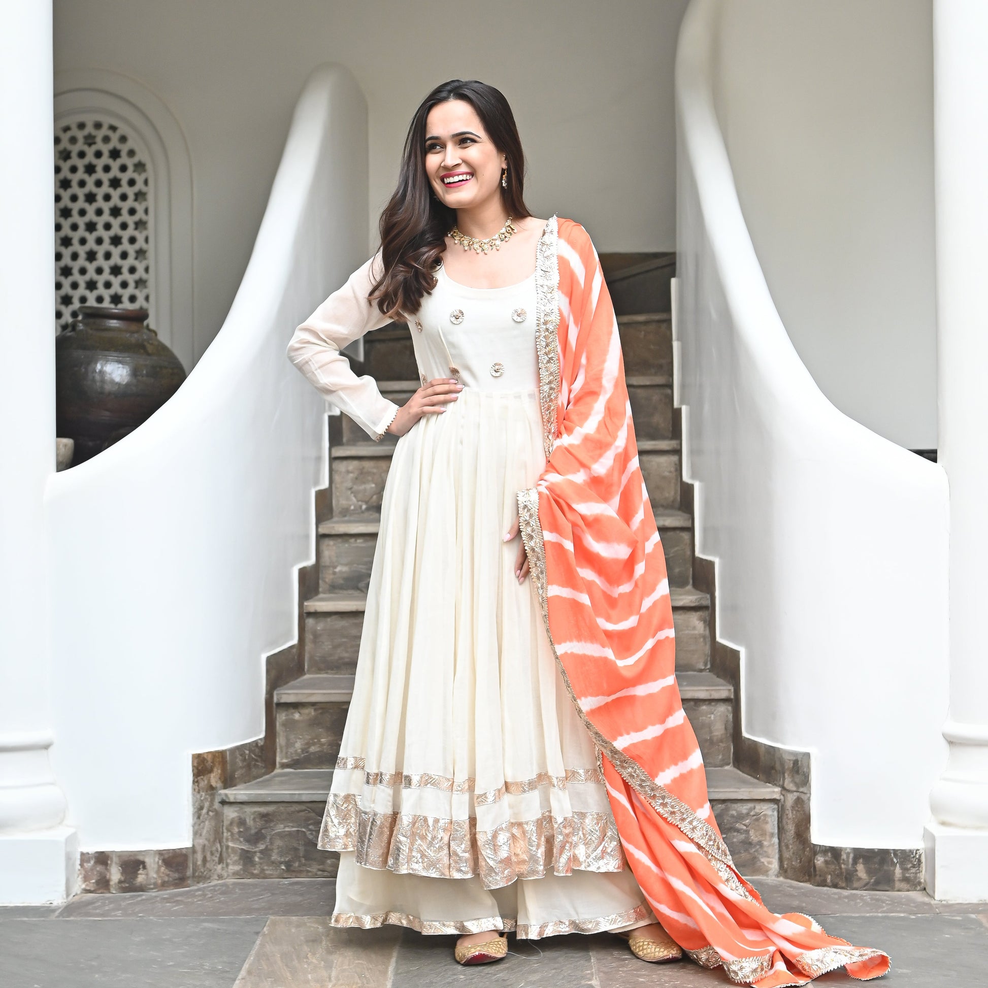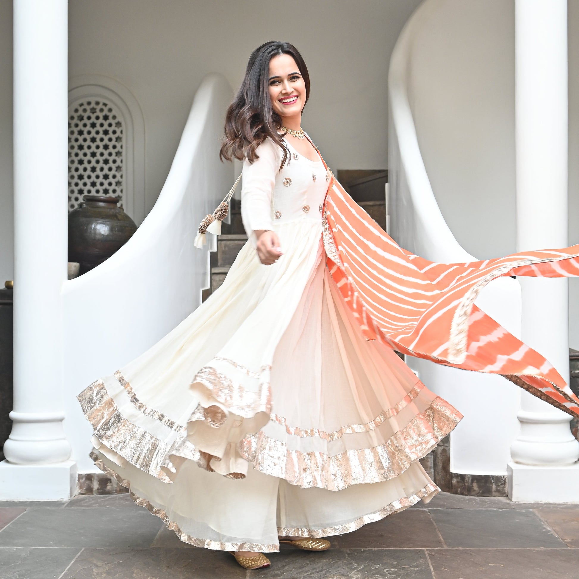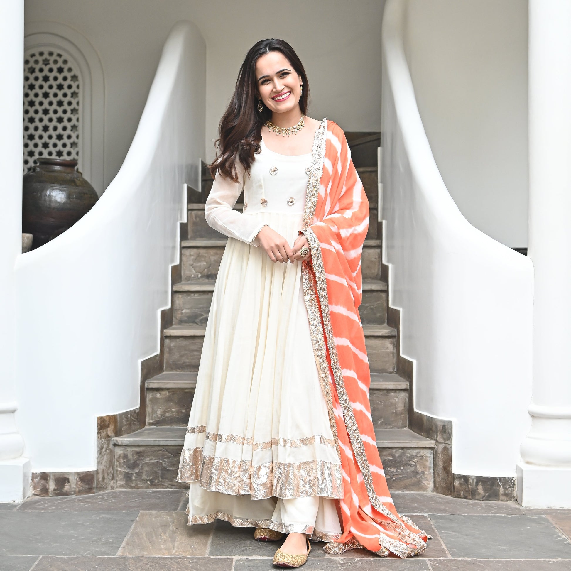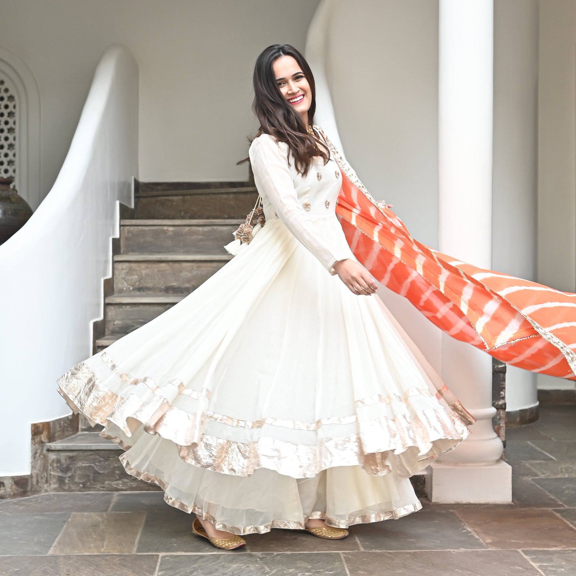 This Zeina Suit Set is a beautiful and elegant traditional Indian outfit that is perfect for any festive occasion. The Suit Set features soft and lightweight white mulmul fabric along with long sleeves and a round neckline. The Set is also adorned with intricate gold details that add a touch of glamour to the garment. The Set has a flared silhouette that creates a beautiful and graceful drape, paired with an orange tie-dye dupatta which adds a vibrant pop of colour to the outfit.